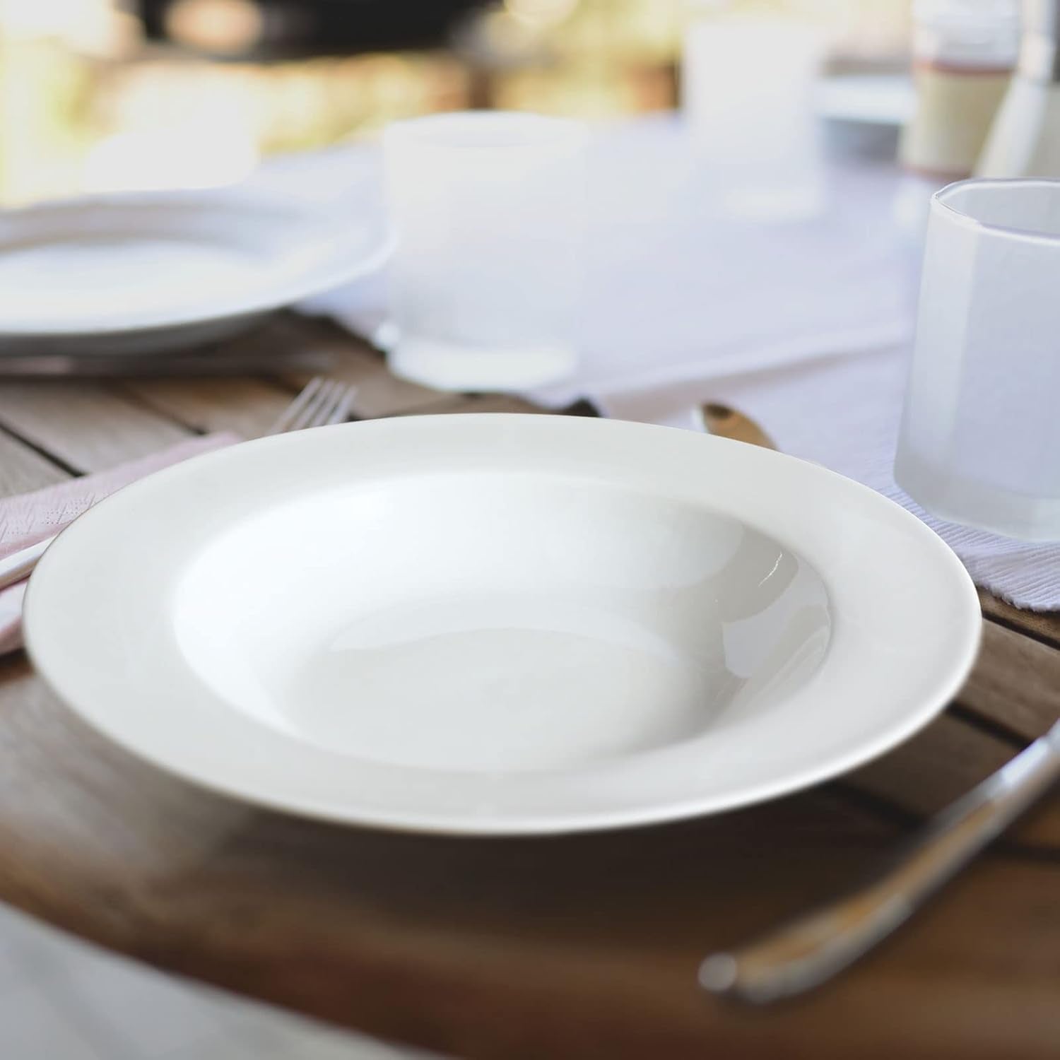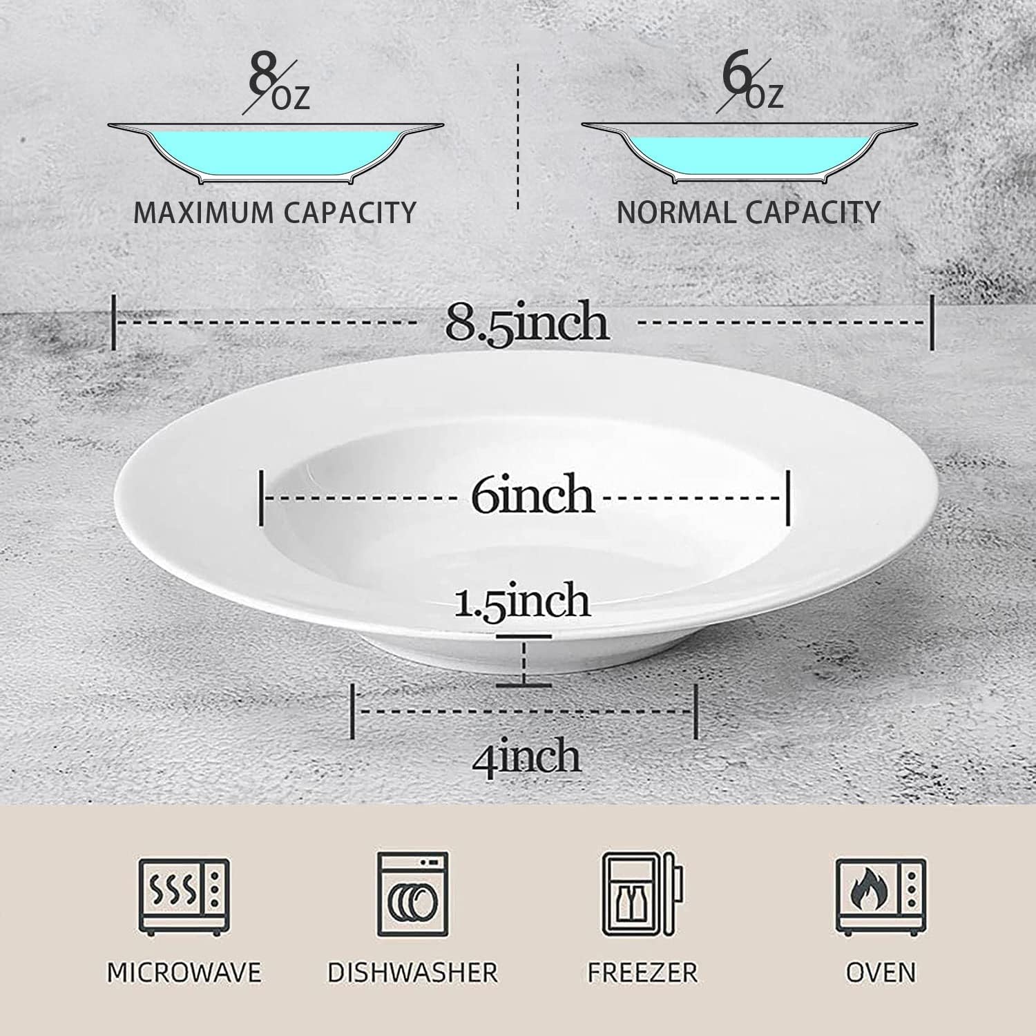 - 【Design for your style】1.5 inches depth, the recessed center area to keep the dishes or sauce from spilling out of the white plates and bowls set. Not too deep, not too shallow and with rim design that make the food cool quicker and easier for you to scoop the last drop. 8 oz amount are good for people who wants controlled portion. Perfect size white pasta bowls that can be dressed up for more formal dinners, or dressed down for every day casual meals.