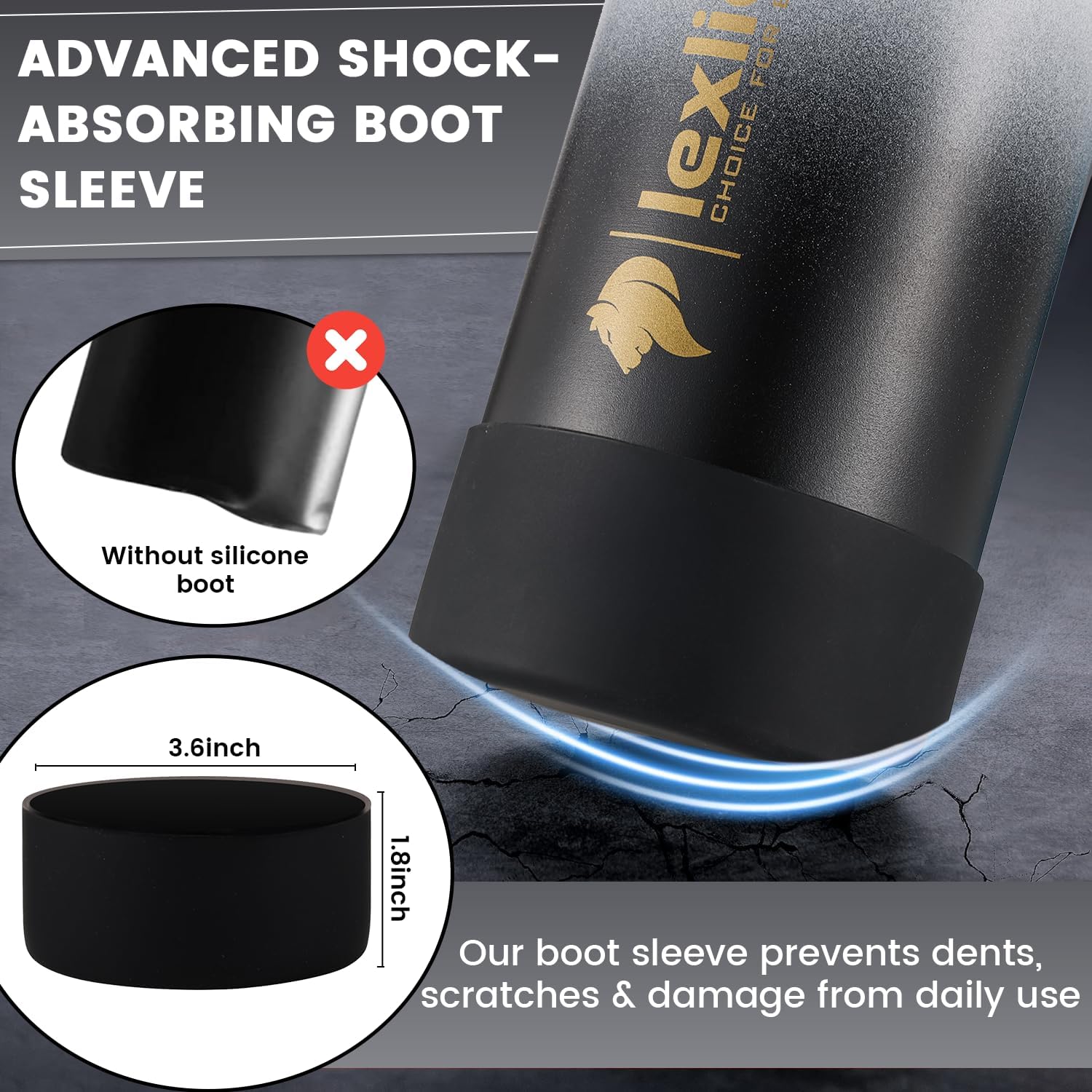 - ✅ SILICON BOOT/SLEEVE- Lexlion 32 oz stainless steel water bottle comes with an advanced shock-absorbing silicone material that helps to protect against dents, dings, scratches, and all the imperfections of your 32 oz insulated water bottle. You are protected against an inevitable drop in your water infuser bottle. This will extend the life of your flask. The infuser water bottle is BPA-free and made of soft and highest-quality material.