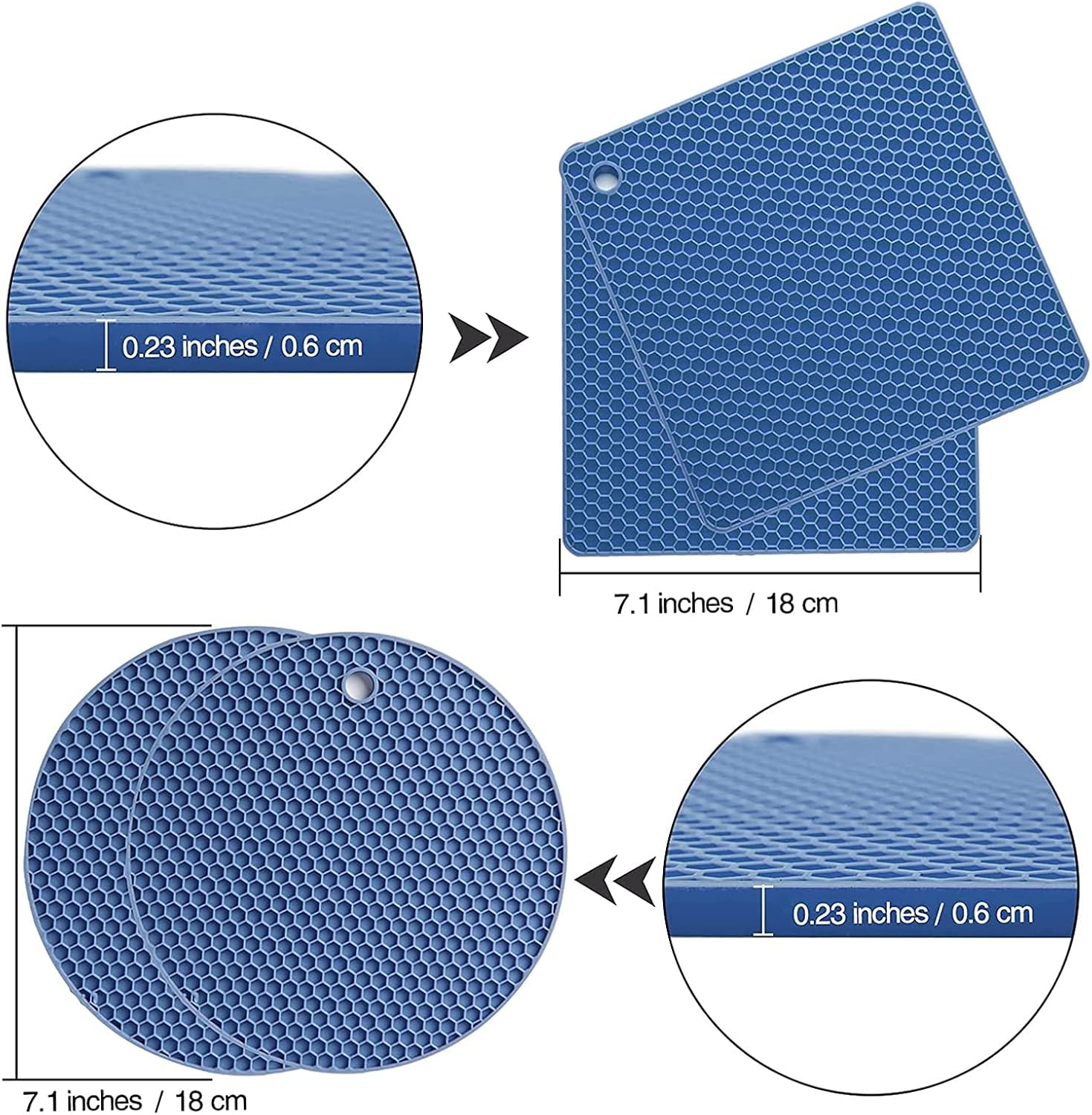 - CIRCLE AND SQUARE SILICONE POT HOLDER: Protect your hands, pans, and countertops with our silicone trivet pack that includes 2 round and 2 square honeycomb silicone pot holders.