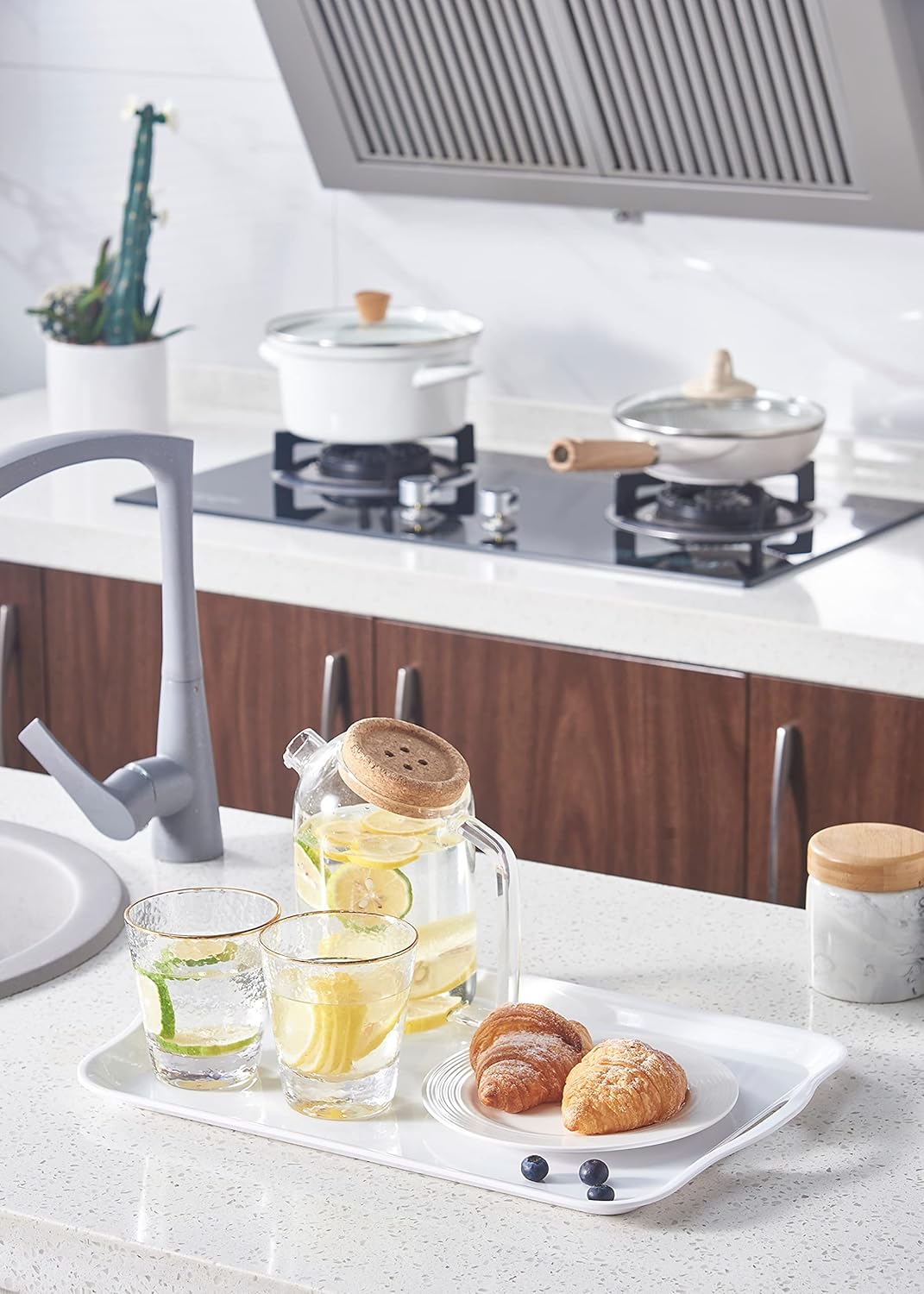 Blue Boat 16.5" x 11.5" Serving Trays Set of 2 White, Dinner Tray, Light Weight Easy to Clean Sturdy Stackable Melamine Serving Tray with Handle, Fruit, Snacks, and Desserts Trays