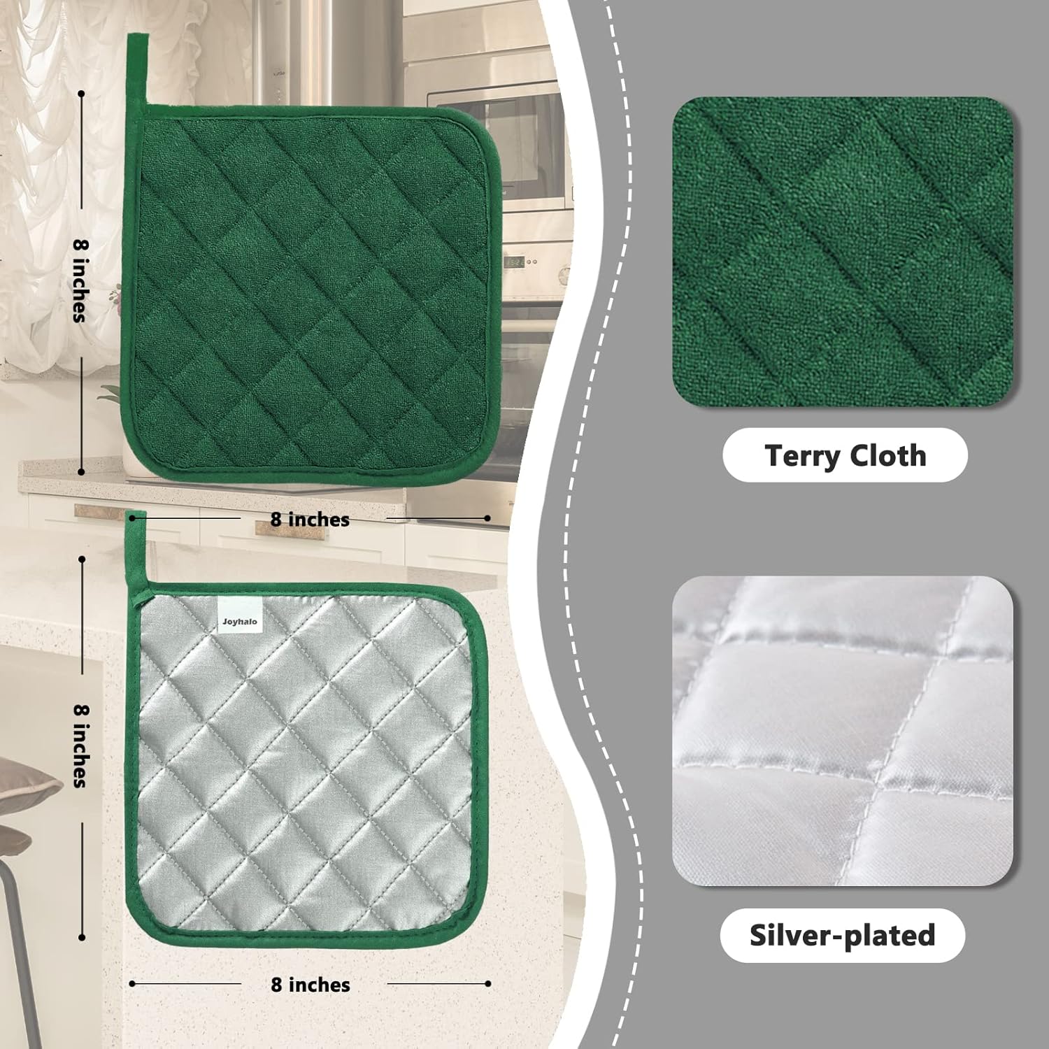 - EXTRA LARGE POT HOLDERS- The size of Joyhalo pot holders is 8x8 inch, larger than most pot holders on Amazon which are only 7x7 inch. Extra large hot pads make it more convenient for more kitchen and Baking usage