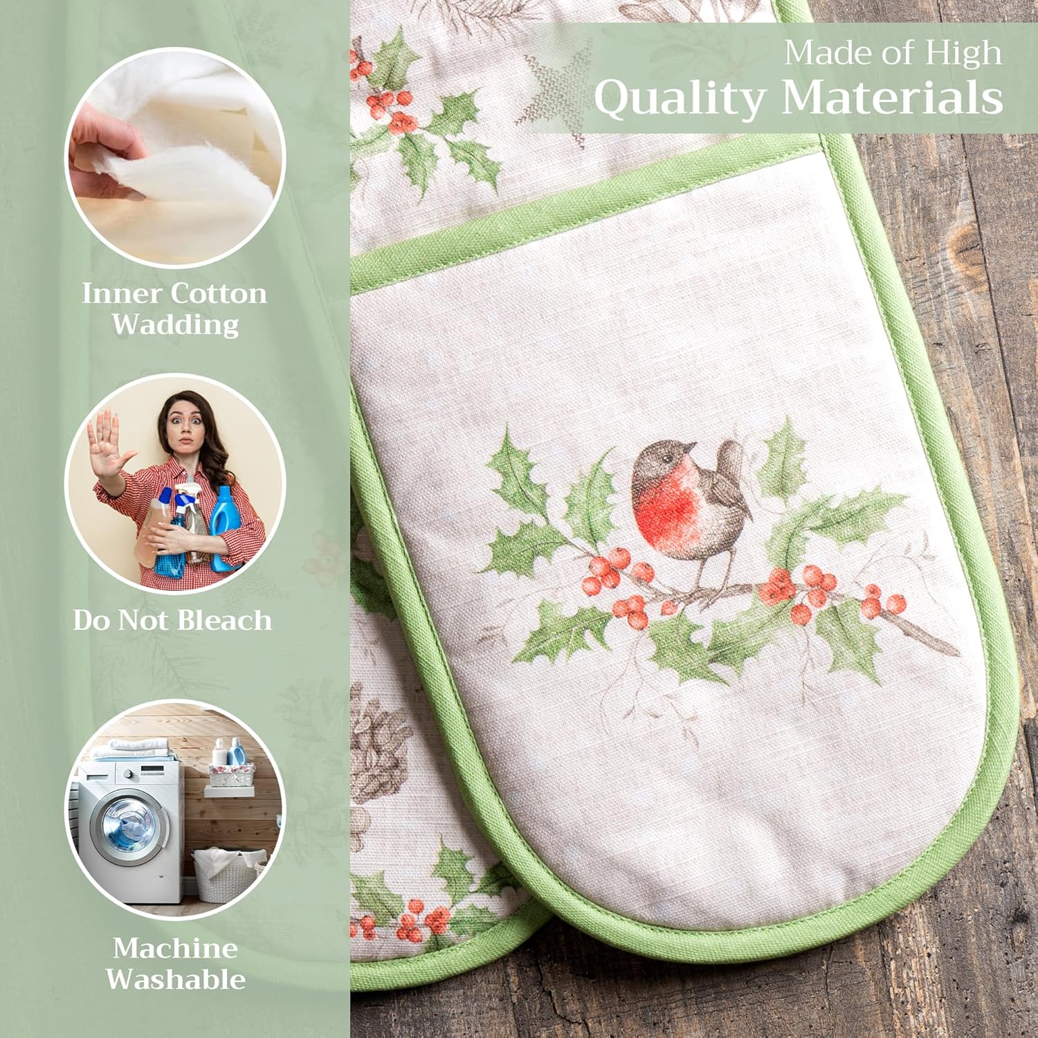 - 100% Quilted cotton: Crafted from premium quilted cotton for superior heat resistance and durability. This double oven mitt offers a soft, flexible grip and protects your hands during baking, roasting, or grilling