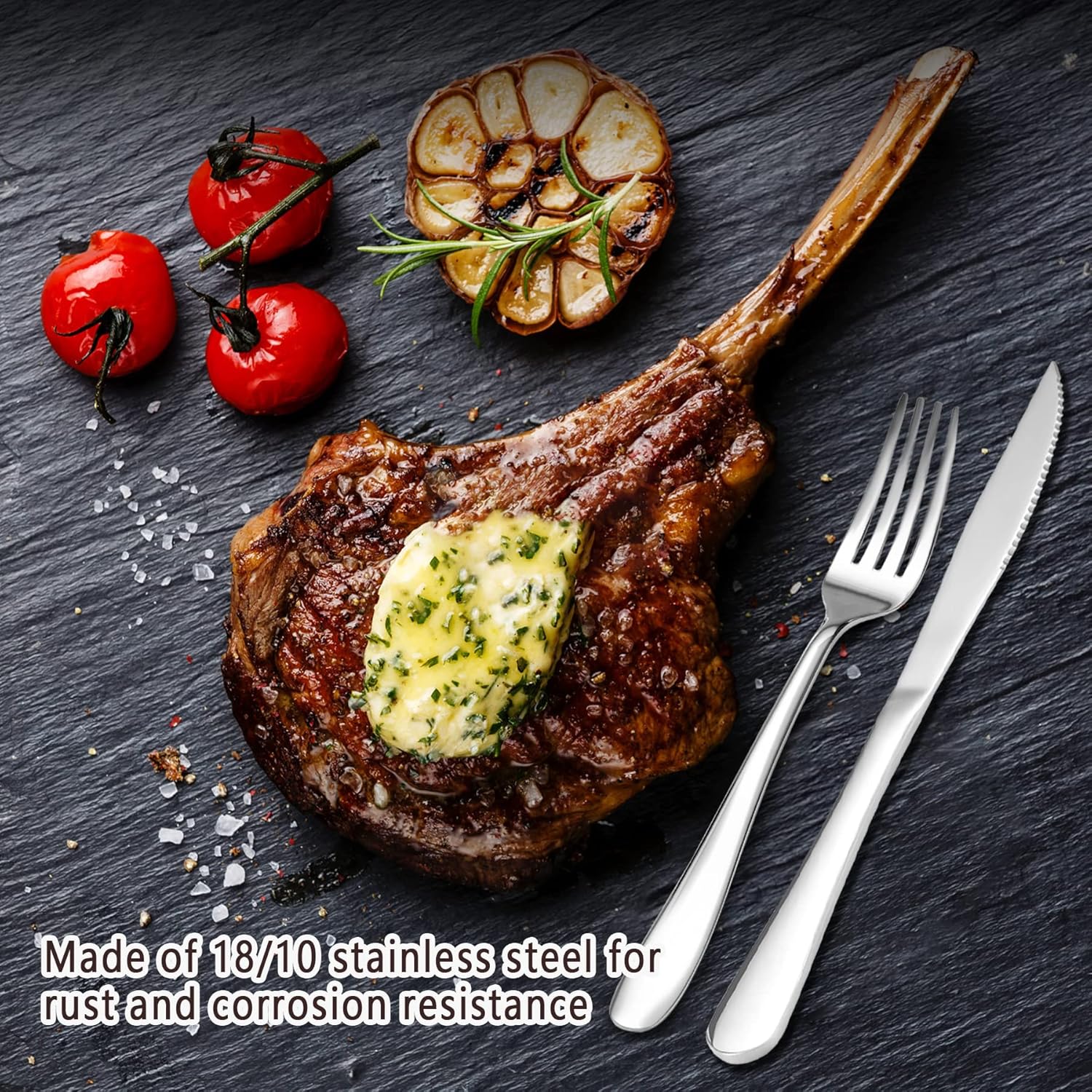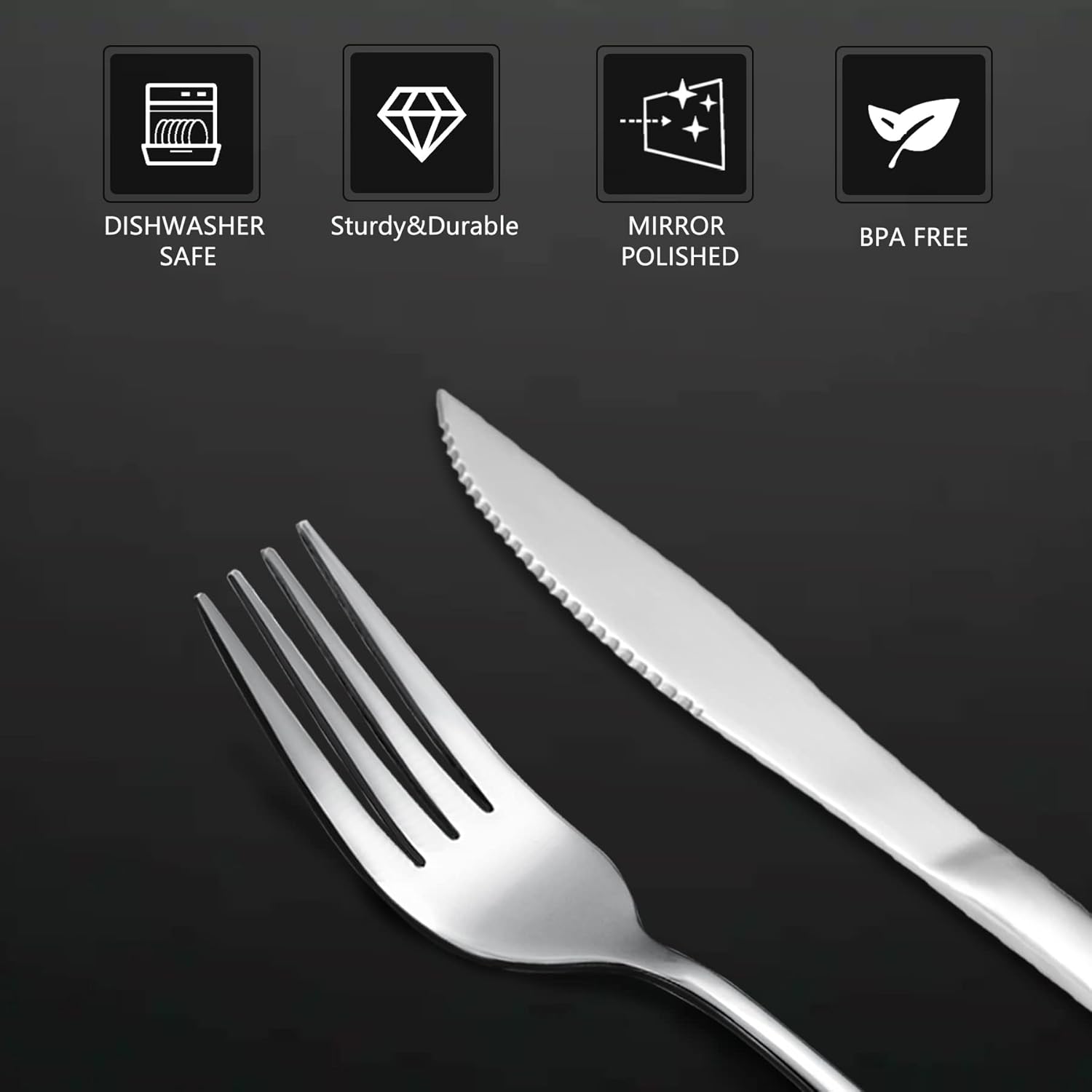 - HIGH QUALITY : SANTUO Direct 12 piece Steel Steak Knives Set are made of top food grade stainless steel. seamlessly add more elegance and class to your table. mirror polish makes these modern silverware always keep shining, They are resistant to rust, corrosion and dishwasher safe.