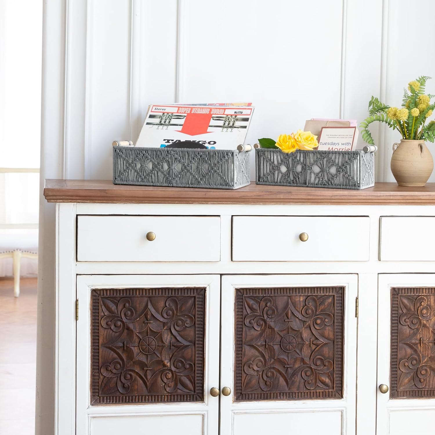 Mkono Macrame Storage Baskets Boho Decor Box Handmade Woven Decorative Countertop Toilet Tank Shelf Cabinet Organizer for Bedroom Livingroom Home, Set of 2, Grey