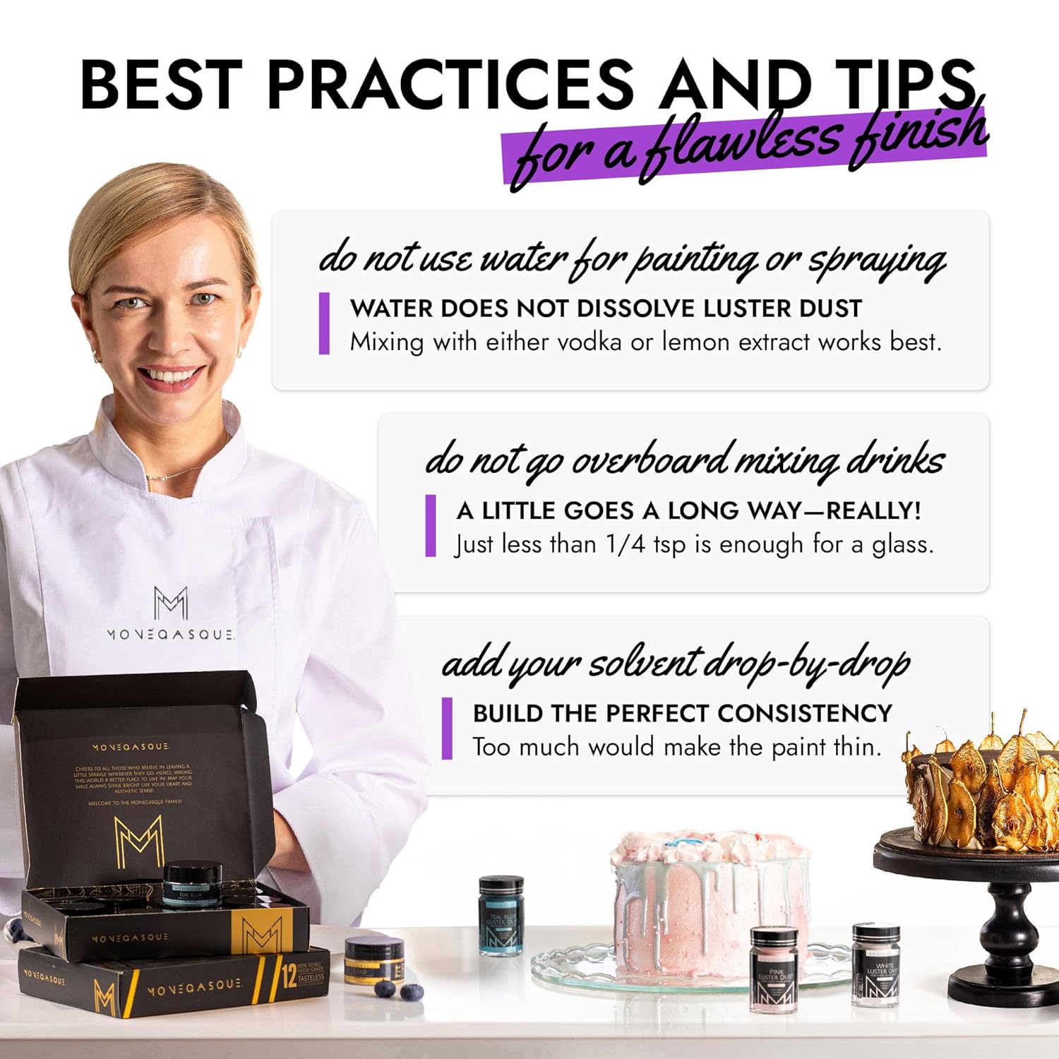 - EASY TO USE: Our purple luster dust is incredibly versatile. Apply with a wet brush, airbrush, or dry brush, and even mix into beverages. Achieve professional-looking results effortlessly at home, whether decorating halloween cakes or adding shimmer to cocktails.