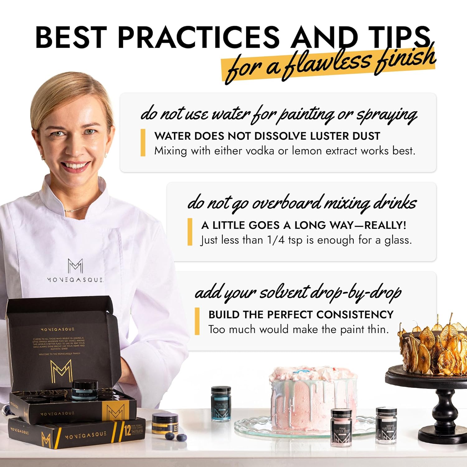 - EASY TO USE: Our gold luster dust is incredibly versatile. Apply with a wet brush, airbrush, or dry brush, and even mix into beverages. Achieve professional-looking results effortlessly at home, whether decorating cakes or adding shimmer to cocktails.