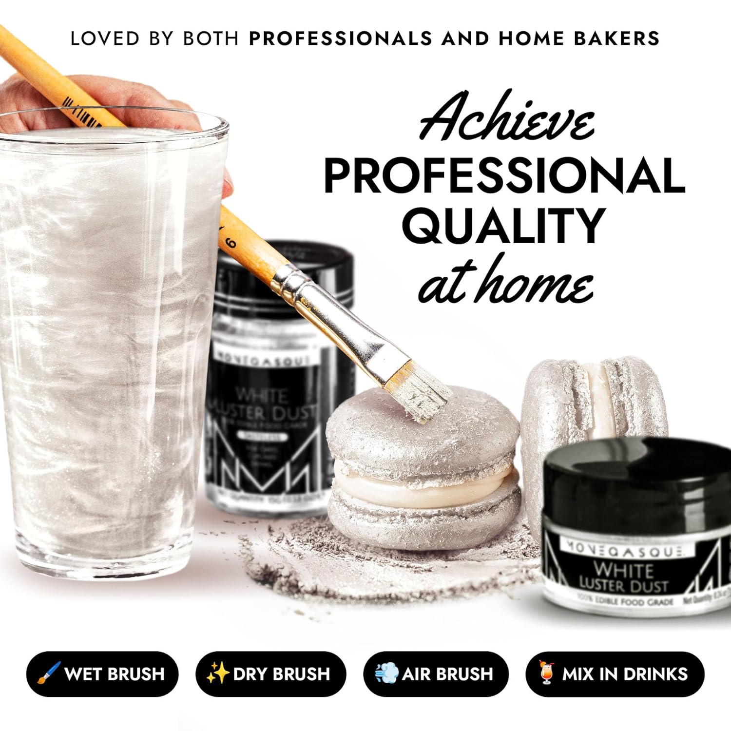 - EASY TO USE: Our white luster dust is incredibly versatile. Apply with a wet brush, airbrush, or dry brush, and even mix into beverages. Achieve professional-looking results effortlessly at home, whether decorating halloween cakes or adding shimmer to cocktails.