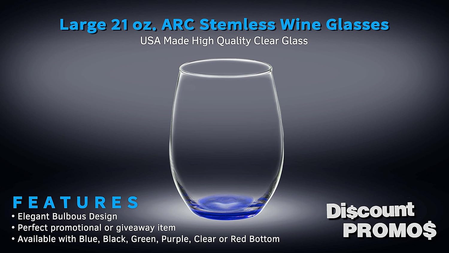 DISCOUNT PROMOS 10 ARC Stemless Wine Glasses Set, 21 oz. - Chardonnay, Cabernet, Merlot, Sauvignon - Blue