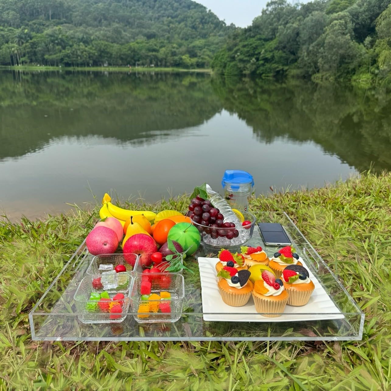 Extra Large Clear Modern Acrylic Ottoman Tray with Cutout Handles 22x22 Inch Over-Sized Serving Tray Organizer Boot Tray Decorative Tray for Living Room Bedroom Entryway and Kitchen Tabletop