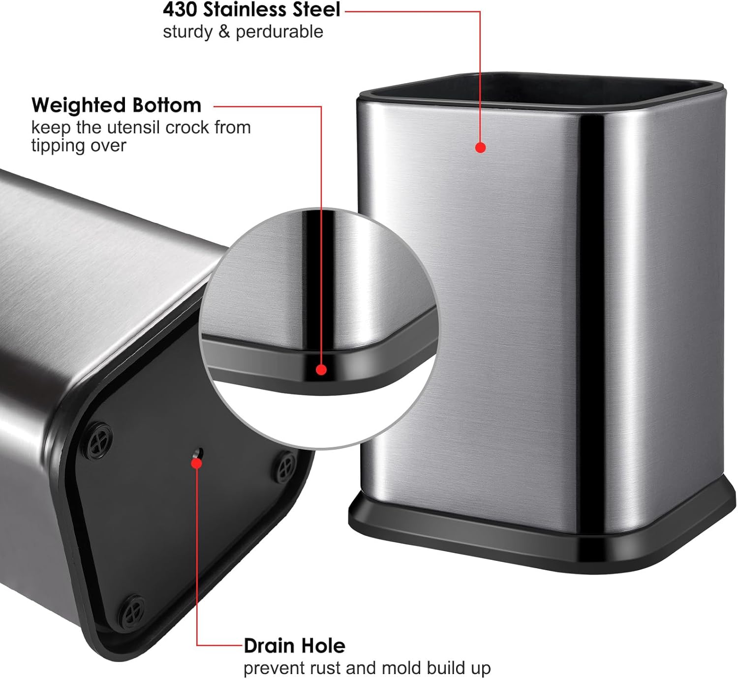 - WIDEN BOTTOM & AIR VENT: The widen bottom keeps the utensil holder from tipping over; The drain hole design, thus preventing rust.