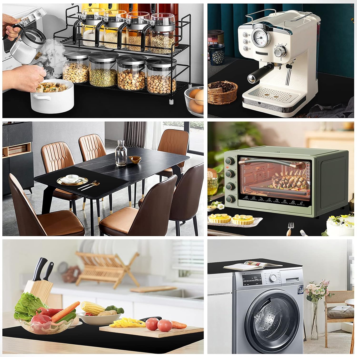 - You Can’t Go Wrong with It: This placemat can solve multiple problems. Great for catching messes. Protect counters from spills, scratches, grease, coffee stains, or damage. Place hot items of all sizes directly on the mat without having to dig through the drawer for a hot pad and no more need for trivets. Reduce the noises made by appliances. No need to worry about items slipping off the countertop. Tools will keep in place. Even if you are rolling dough hard on it, the mat won't slide