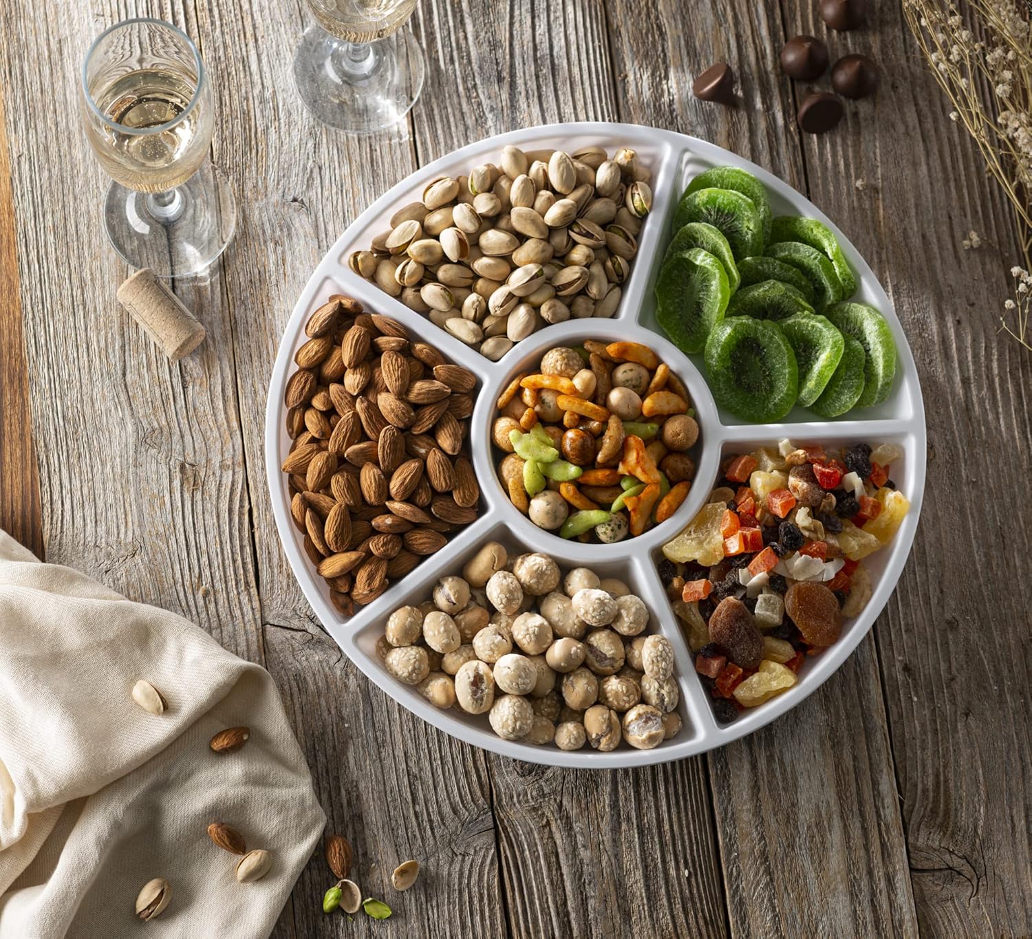 - SIZE 12” round serving plate consists of 6 divided sections with a center dip section which is excellent for serving snacks and appetizers. Its each section are amply sized for chips and salsa, veggies and dip, shrimp and cocktail sauce and much more