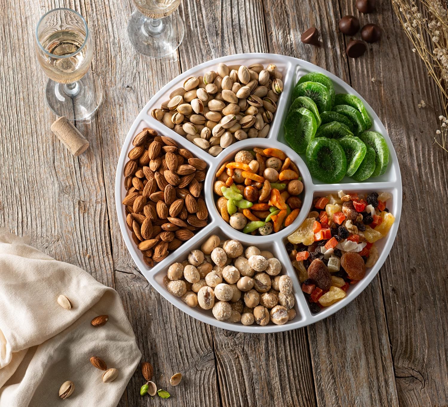 - SIZE 12” round serving plate consists of 6 divided sections with a center dip section which is excellent for serving snacks and appetizers. Its each section are amply sized for chips and salsa, veggies and dip, shrimp and cocktail sauce and much more