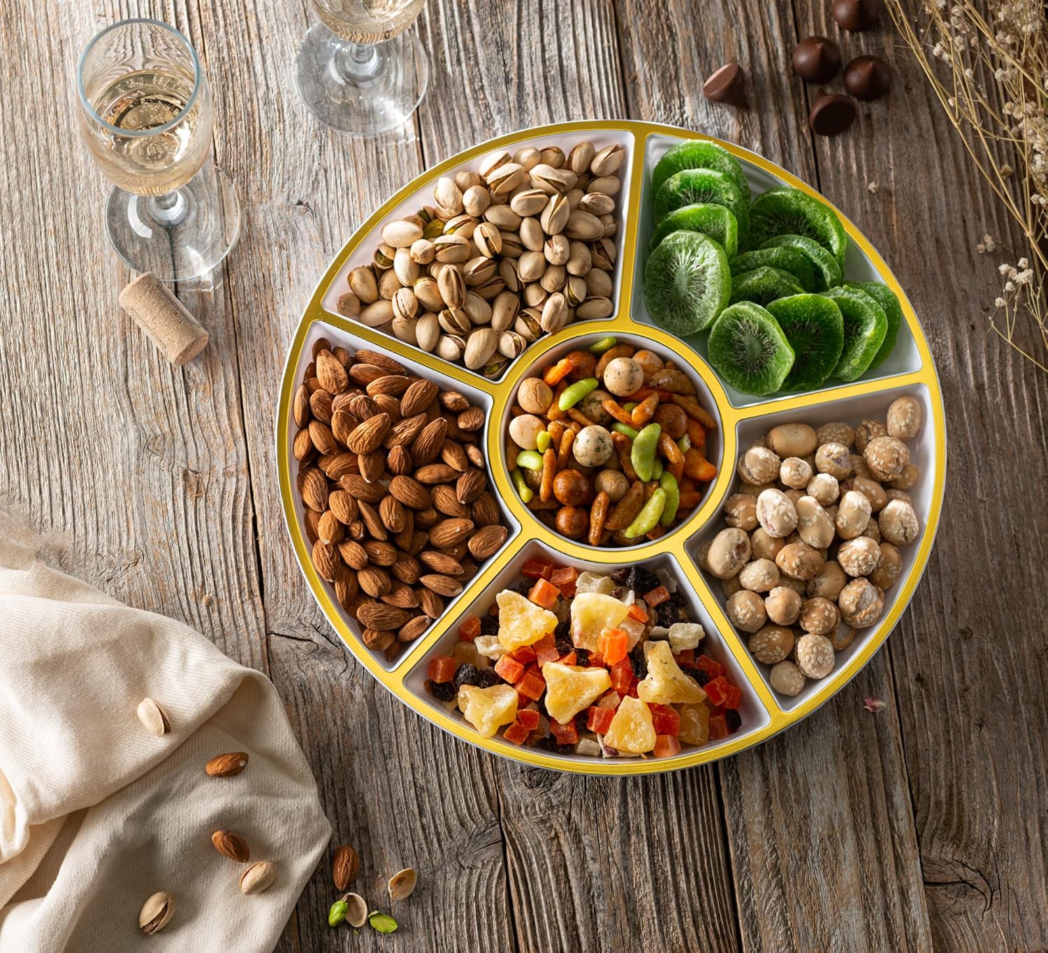Plasticpro 6 Sectional Round Plastic Serving Tray/Platter (8, White & Gold)