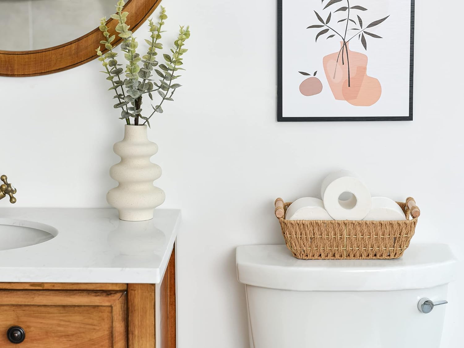 - Versatile woven baskets for toilet paper, hand towels, toiletries in bath, or spices, canned foods in kitchen.