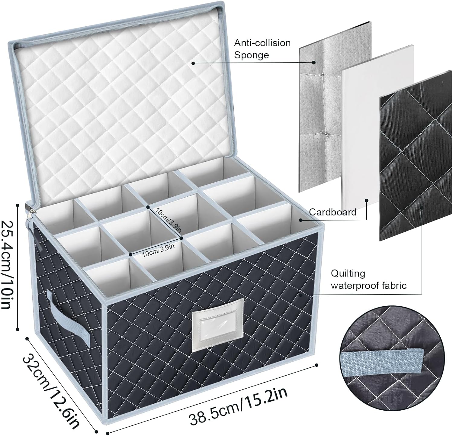 VERONLY Wine Glass Storage Box with Dividers Holds 24 Stemware Storage Cases or China Crystal Glassware Containers with Handles and Lable Window (15.5" x 12.5"x10")-Set of 2 Grey