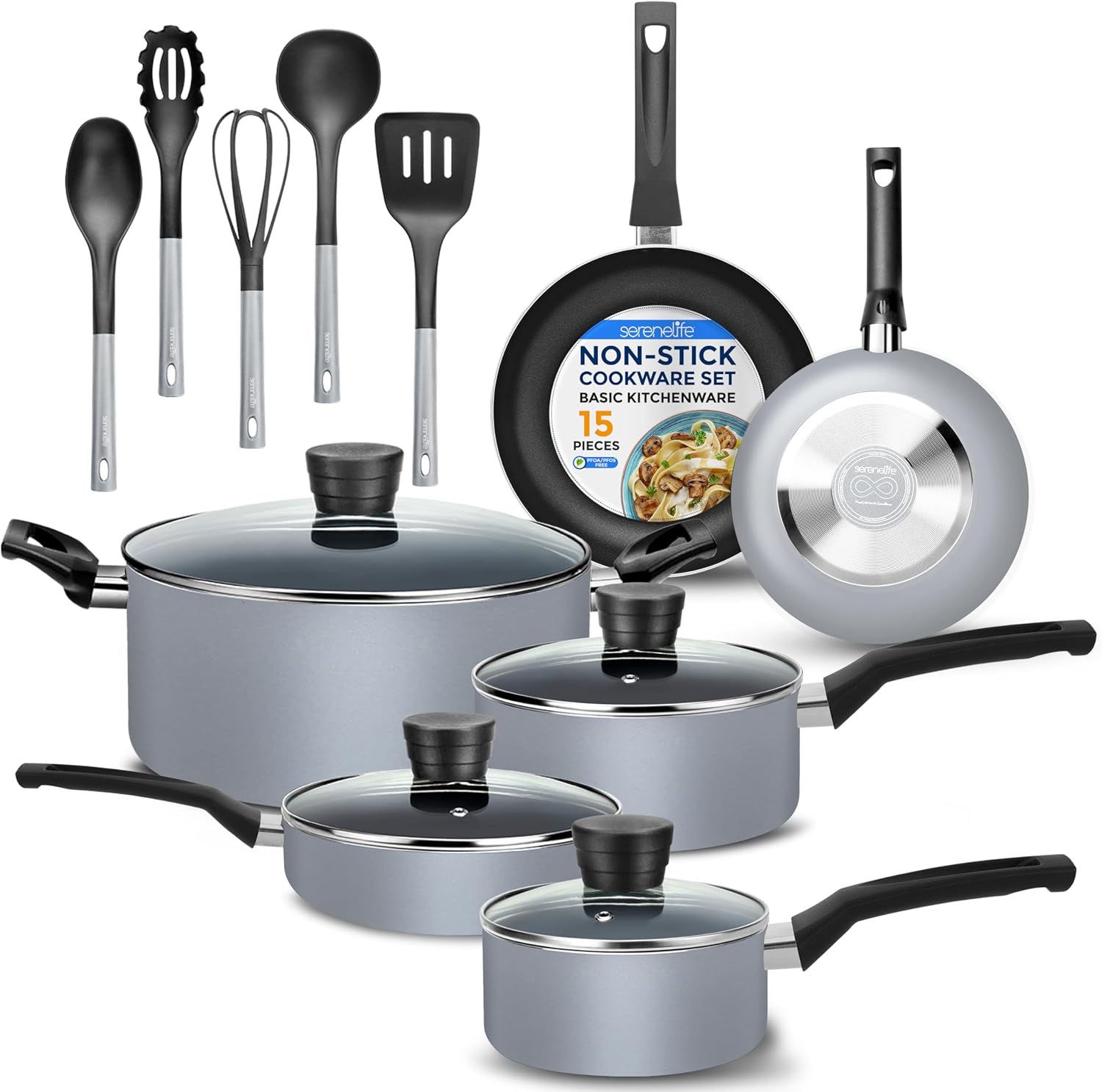 - 15-PIECE SET: The SereneLife Cookware Set features 15pc nonstick cookware set which includes 0.89 & 1.90qt sauce pots w/ lids, 4.70qt dutch oven pot w/ lid, 2.5qt saute pan w/ lid, 8” & 10” fry pans, spoon, spatula, pasta server, ladle, and egg whisk