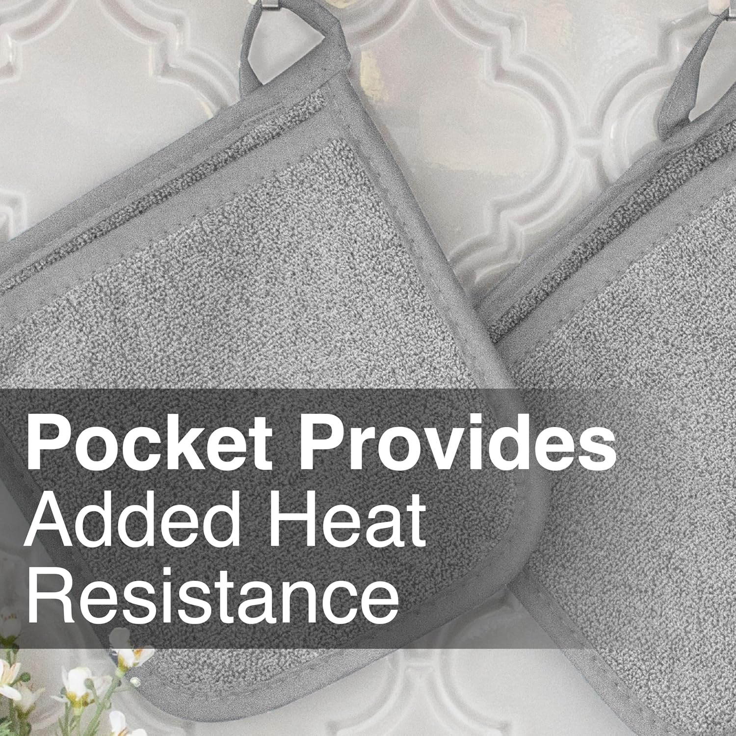 - DURABLE 100% COTTON. We believe in delivering only the best to your kitchen, which is why our pocket mitts are expertly crafted from 100% terry cloth cotton. This premium material is designed to withstand the rigors of everyday cooking while providing top-notch heat protection.