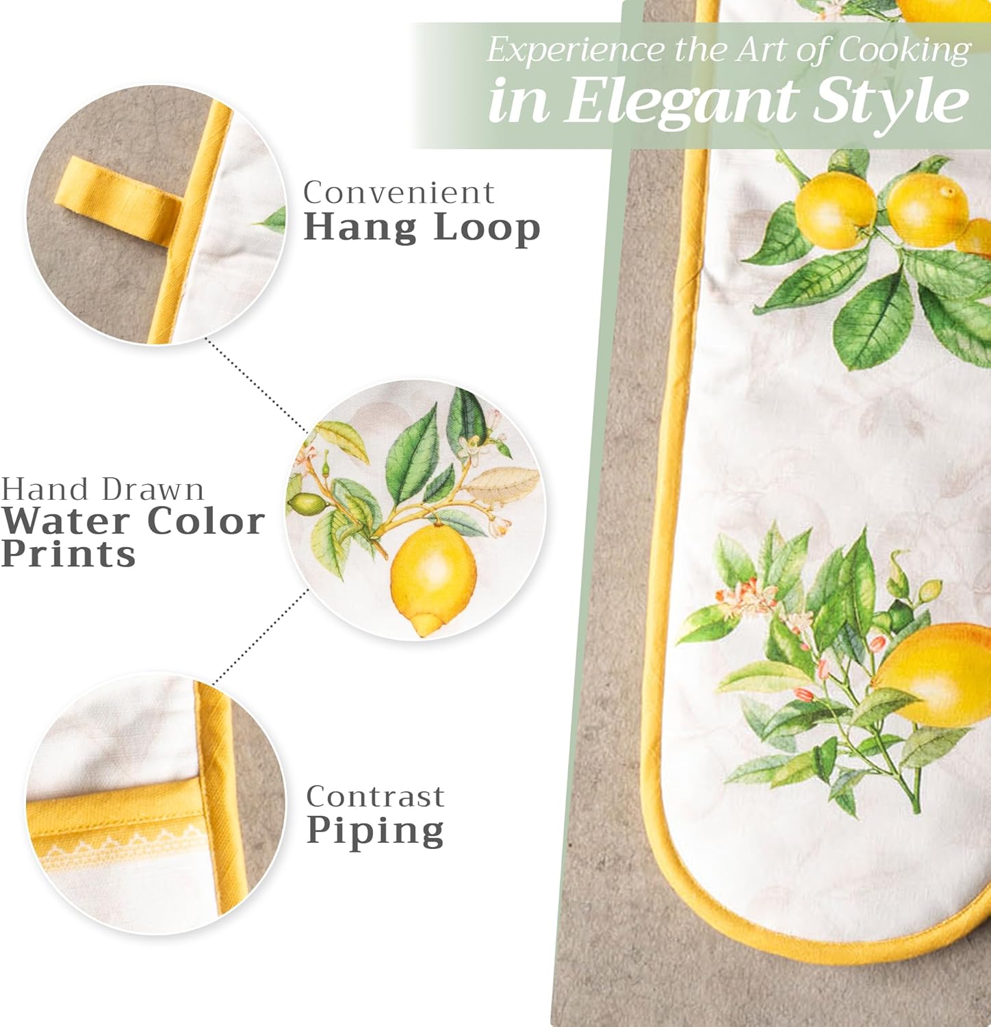 Maison d' Hermine Double Oven Mitts 100% Cotton 7"x35" Double Oven Mitt Heat Resistant BBQ Cooking Gloves with Loop, Baking, Grilling, Home, Kitchen, Handling Hot Pans Spring Summer (Limoncello)