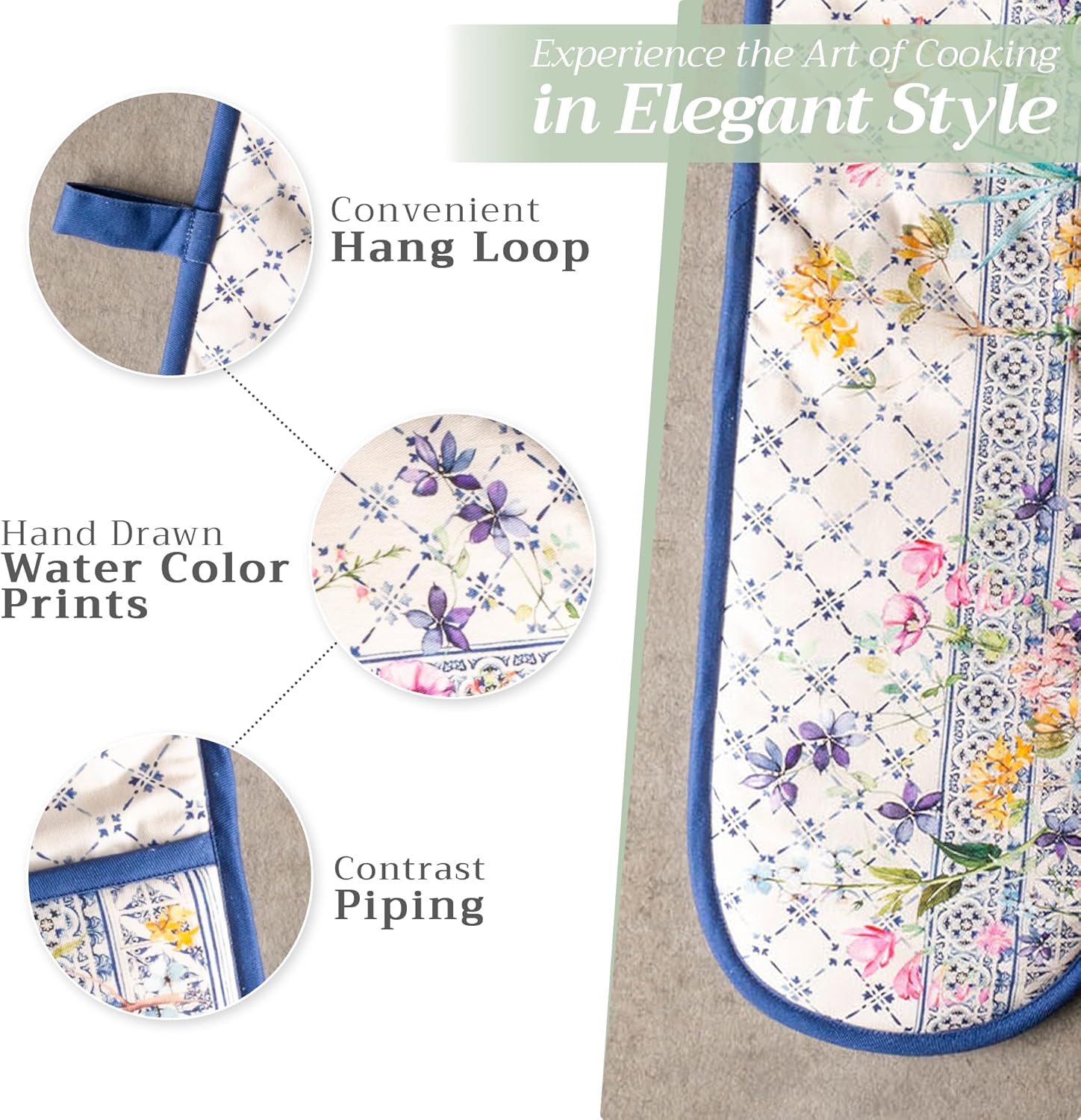 - Package includes: Includes 1 double oven mitt sized 7"x35". Perfect for handling hot cookware safely while adding a touch of European elegance to your kitchen. Designed in Europe and made in India with care