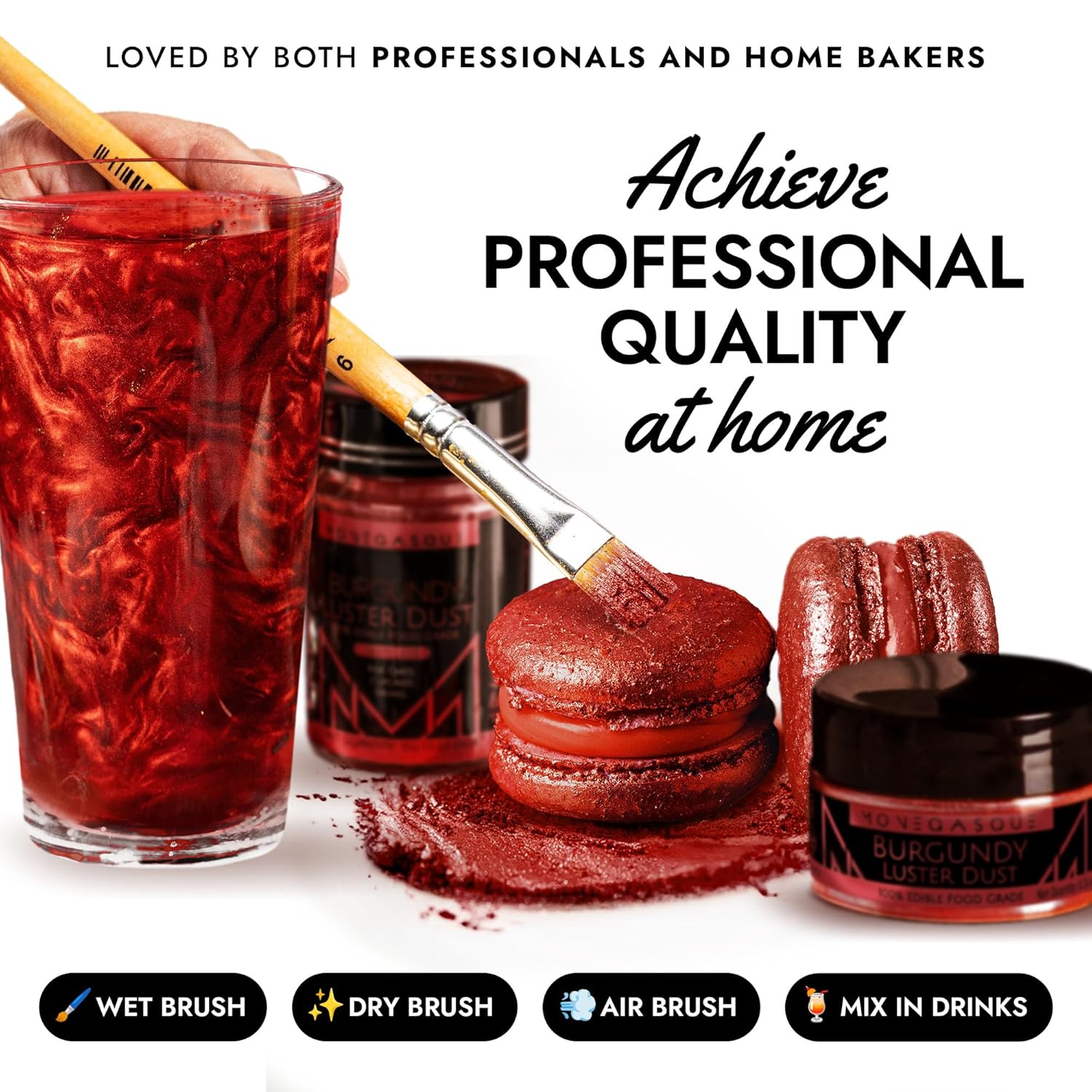 - EASY TO USE: Our burgundy luster dust is incredibly versatile. Apply with a wet brush, airbrush, or dry brush, and even mix into beverages. Achieve professional-looking results effortlessly at home, whether decorating halloween cakes or adding shimmer to cocktails.