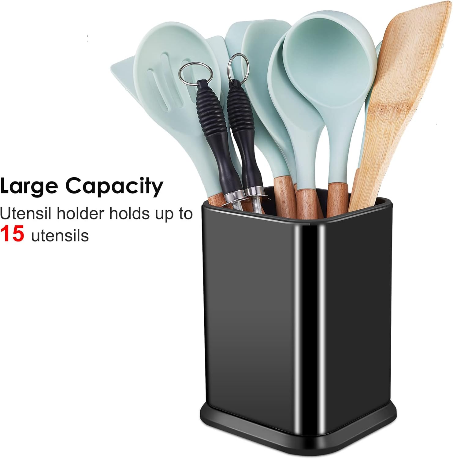 - LARGE CAPACITY & SPACE-SAVING: Extra large size to conveniently store up to 15 utensils and doesn't take up most of the space in your cabinet or counter; This kitchen utensil holder fits for spatulas, soup ladles, spoons, whisks, tongs and more.