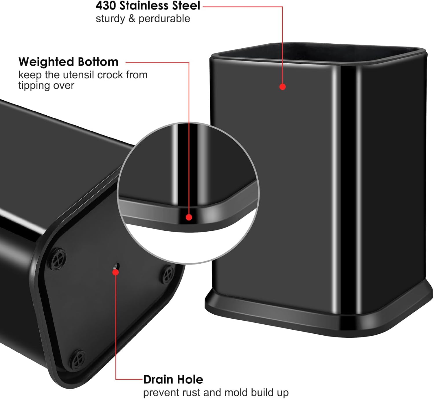 - WIDEN BOTTOM & AIR VENT: The widen bottom keeps the utensil holder from tipping over; The drain hole design, thus preventing rust.