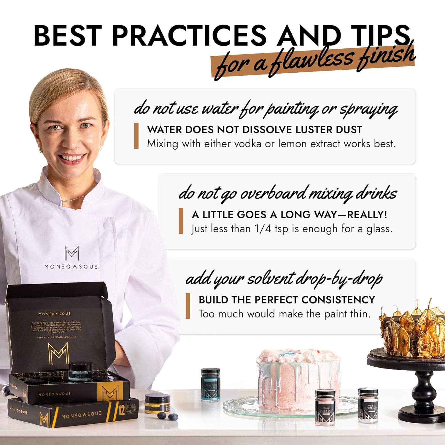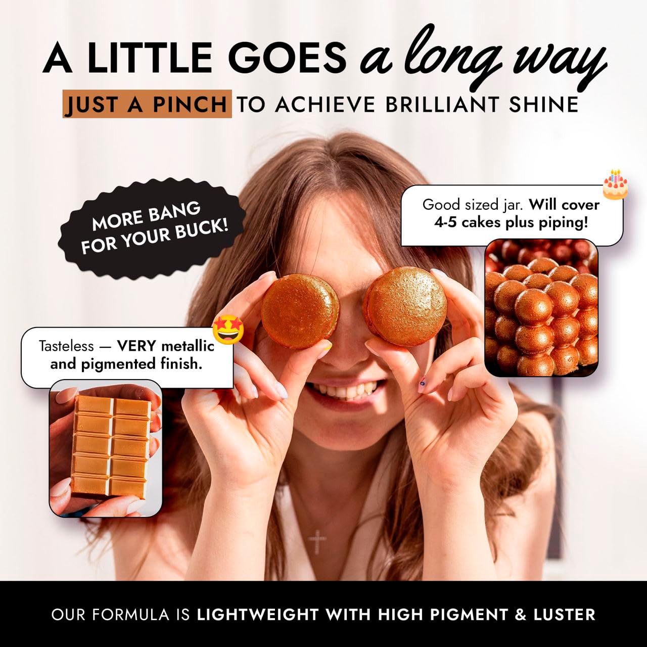 - EASY TO USE: Our bronze luster dust is incredibly versatile. Apply with a wet brush, airbrush, or dry brush, and even mix into beverages. Achieve professional-looking results effortlessly at home, whether decorating halloween cakes or adding shimmer to cocktails.