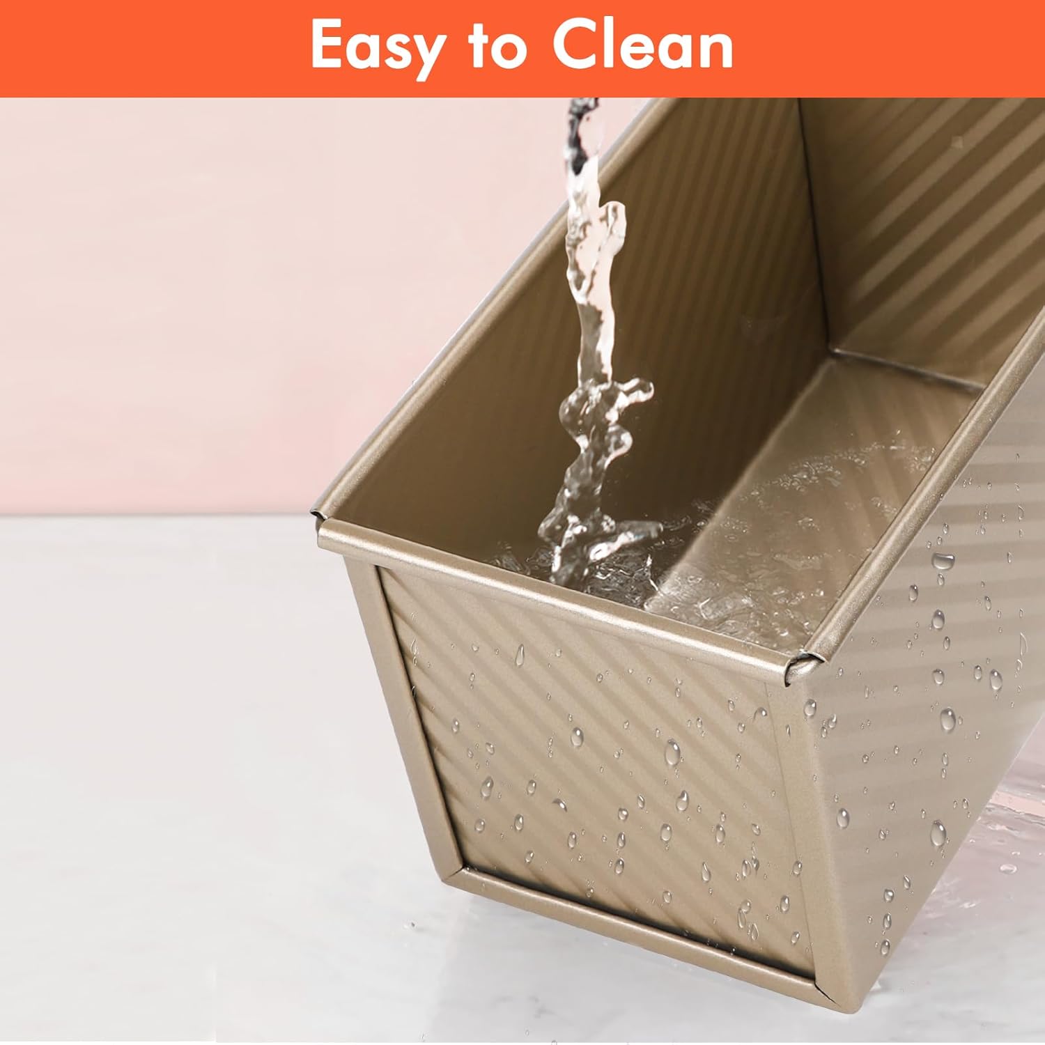 - 【Non-Stick Coating & Easy to Clean】The pretty slick nonstick coating on loaf pan which is easy to clean, and bread dough and baked bread releases from it easily. Also, it is easy to use, you can easily pop out bread from gold toast pan to get a nice shape.