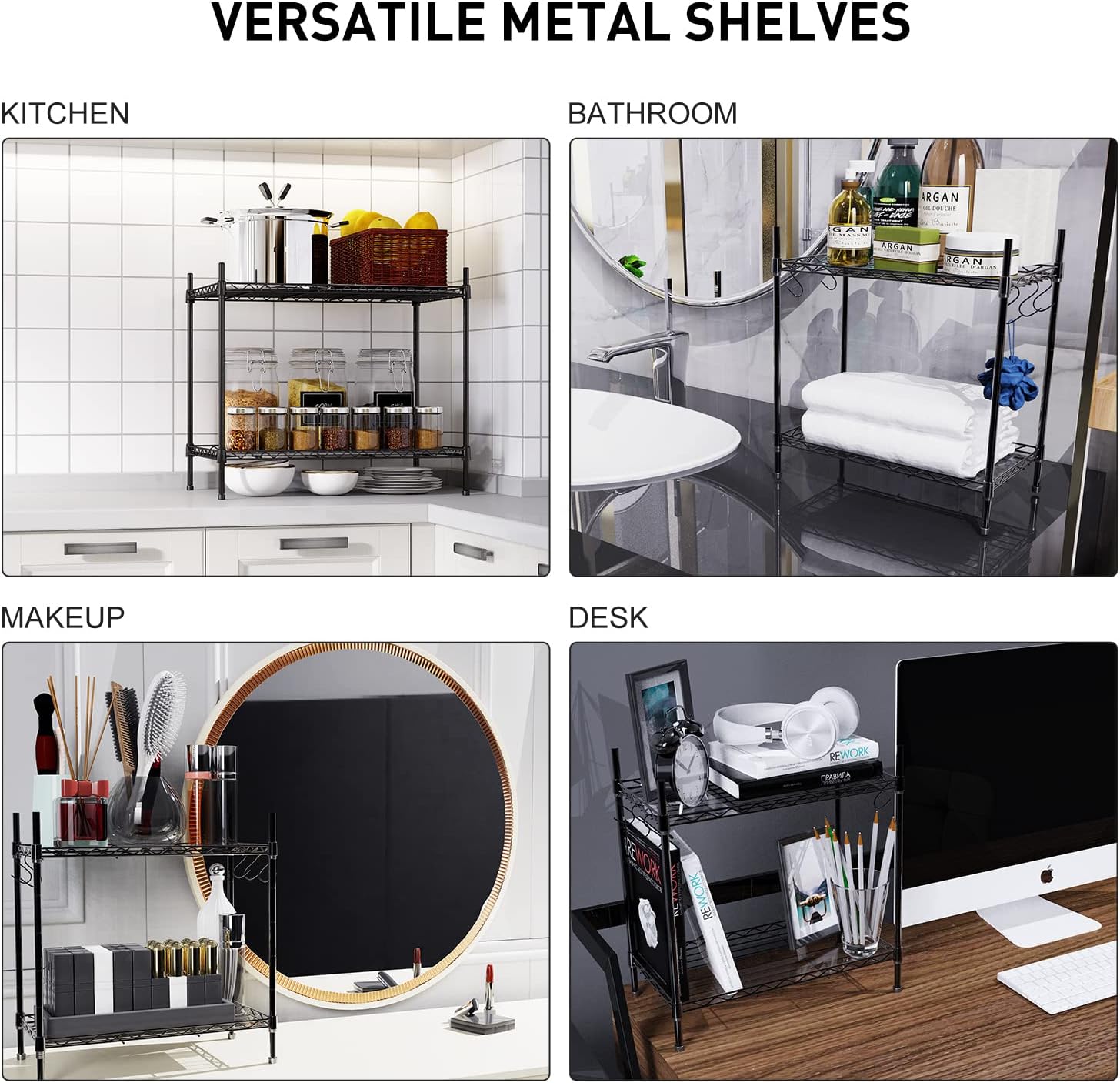 - 【Modern Spice Rack】Storage shelves are NSF certified and licensed. The classic colors and simple design make the modern shelving suitable for any decor. It can be placed in your kitchen, bathroom, living room, bedroom, kitchen, pantry, office and many more places to keep your home organized.