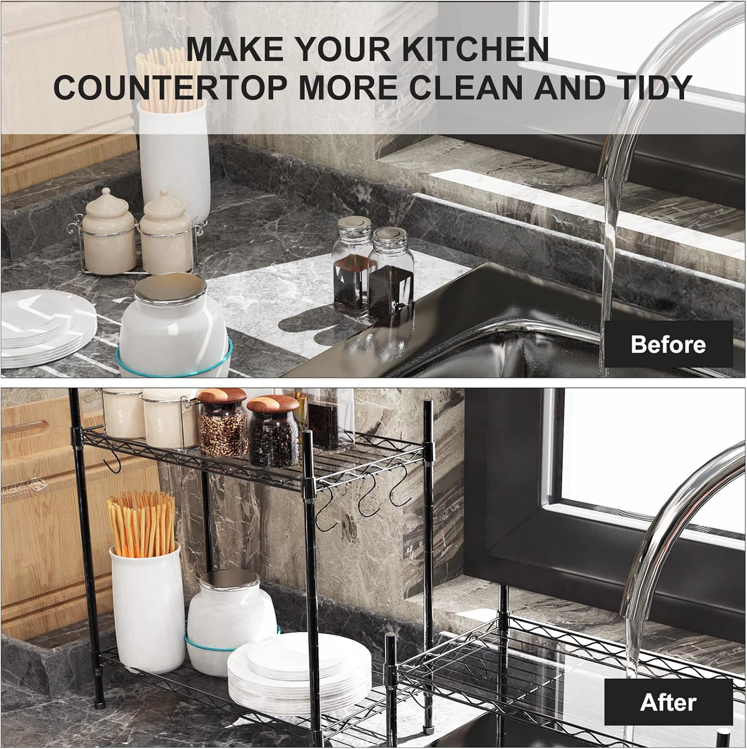 - 【Easy Assembly & Adjustment】Assembly has never been easier, with no tools required to assemble, and it only takes you 5 minutes to install the countertop organizer. Storage shelves is designed with easy adjustable clips, and the height of each layer can be adjusted by moving the cross bar up and down to meet the different height needs of different objects.
