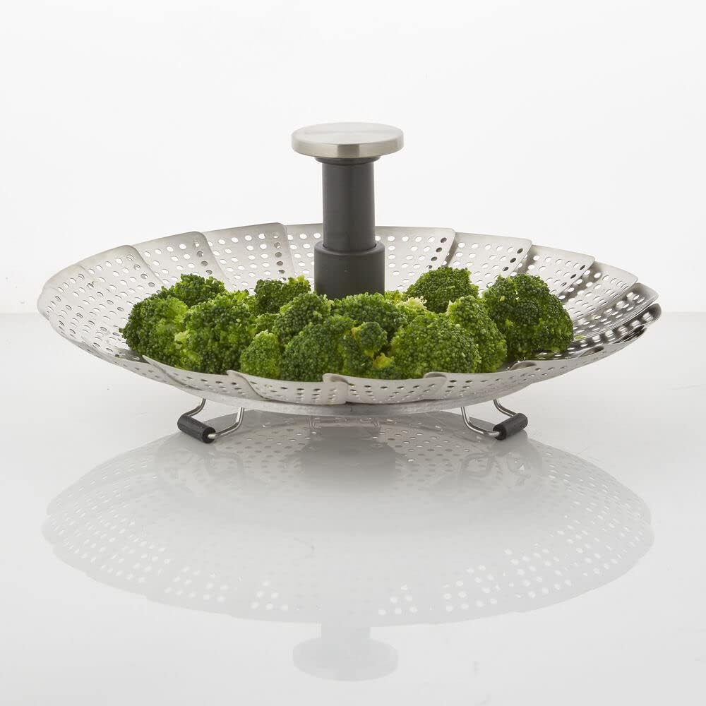 - ADJUSTABLE HANDLE: extends and locks in place for filling or transporting; retracts to fit in lidded pots while steaming and makes storage easy