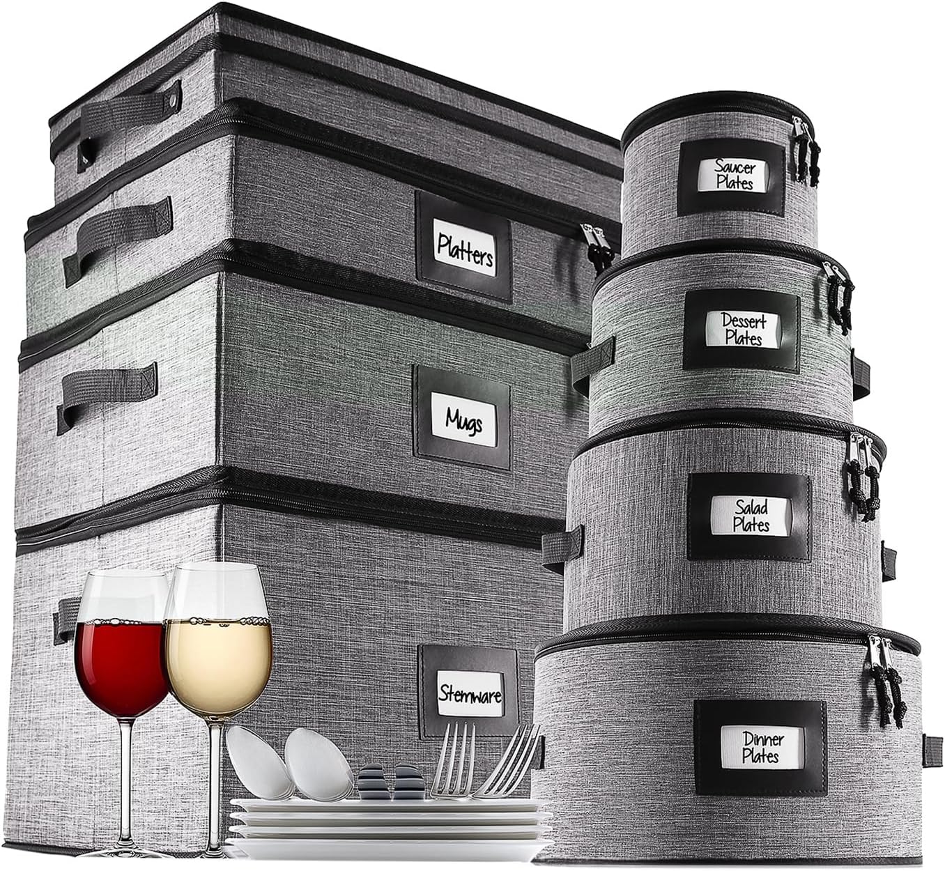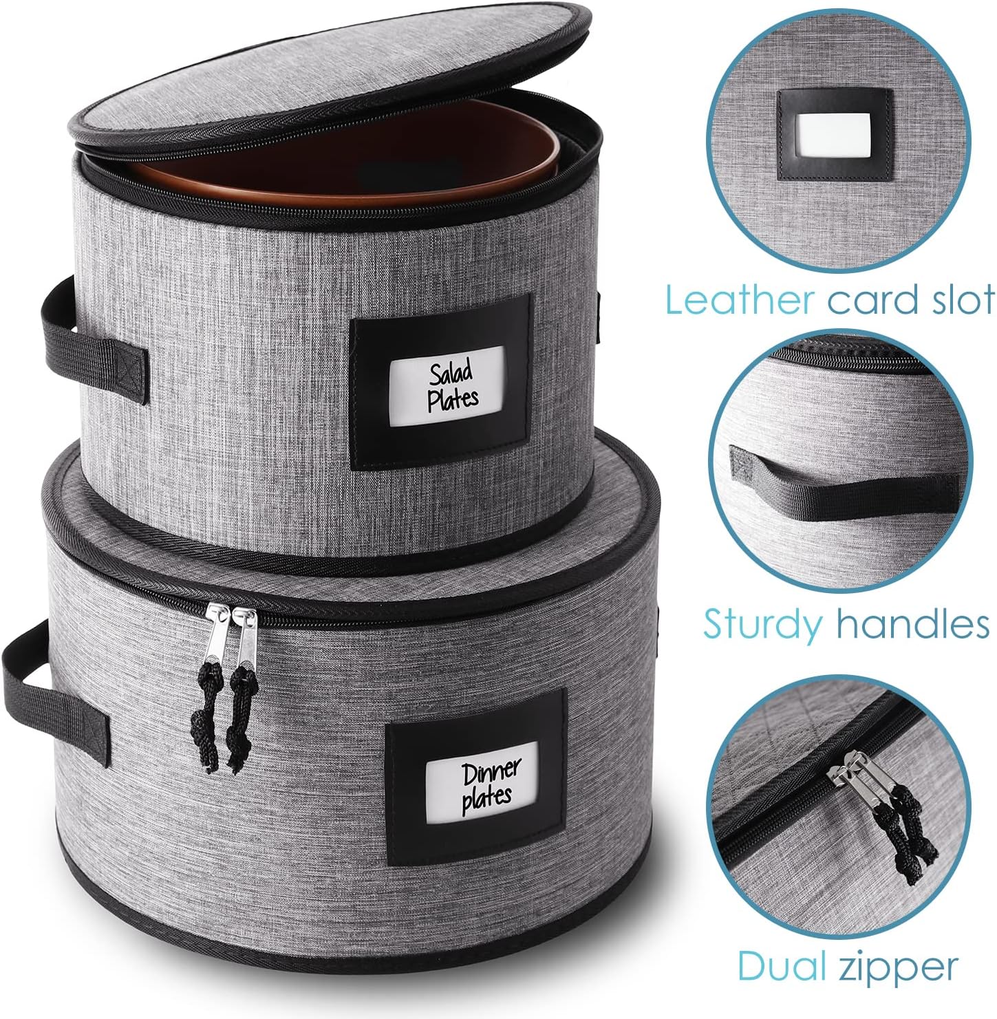 - CONVENIENT and STYLISH: Our dish storage protectors boast sturdy handles, zippered lids, and faux leather label slots. The silverware case features a clear window.