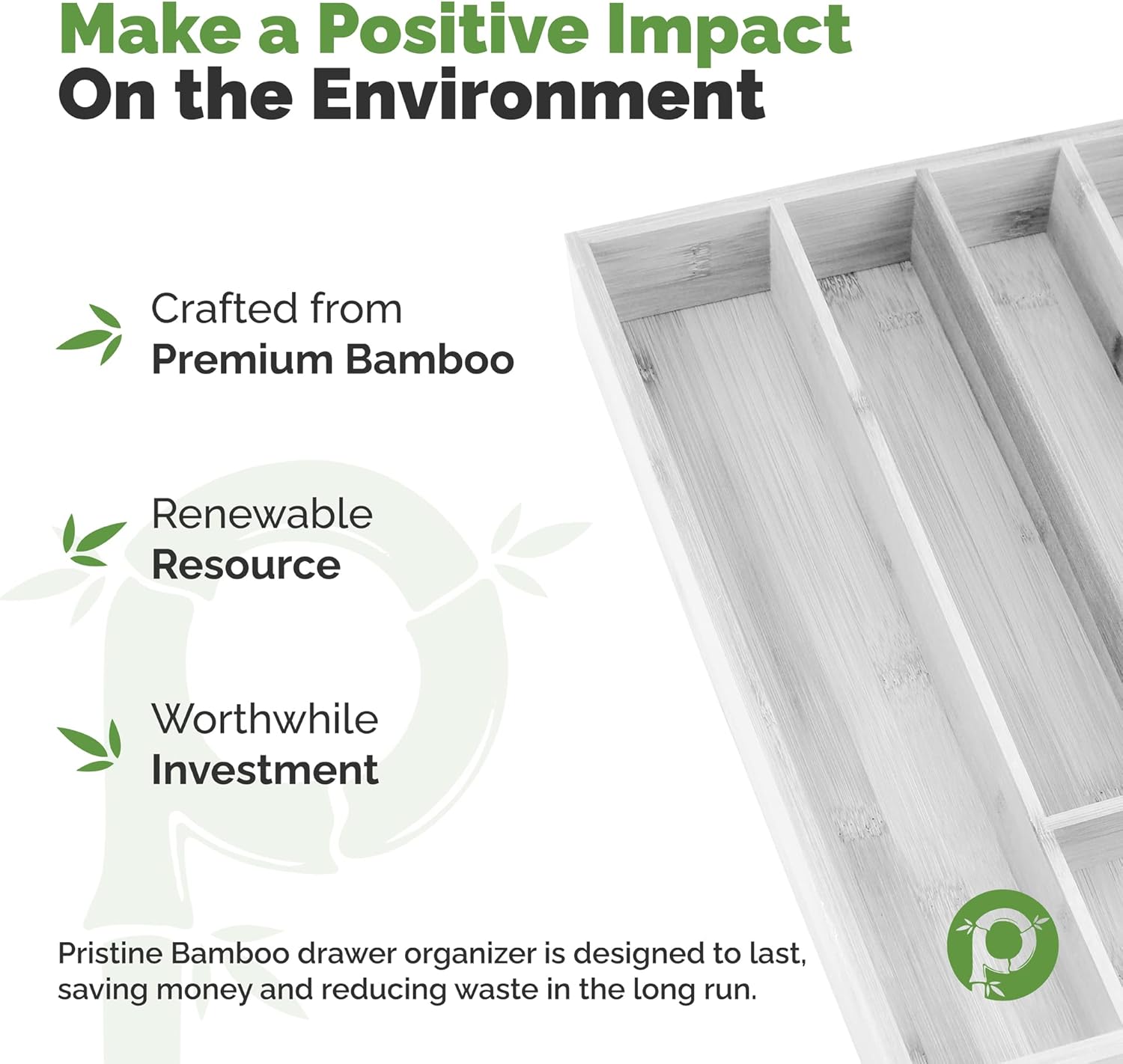 - STORAGE SPACE PROBLEMS SOLVED: Why not use the space in your kitchen drawers to store all those utensils? With Pristine Bamboo sleek, stylish kitchen utensil organizer for drawers, you'll be able to put away larger tools like spatulas and whisks while still having plenty left over for smaller gadgets.