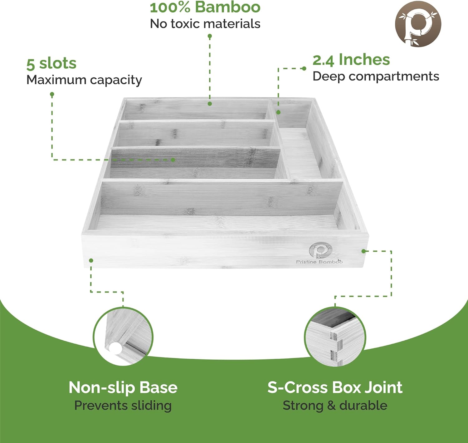 - SUPERIOR DESIGN SOLUTIONS: When you need a drawer organizer that is both beautiful and practical, there's no better option than the 10-inch Pristine Bamboo Silverware Drawer Organizer. This all-inclusive product offers 100% bamboo construction with No Toxic MDF material for strength--even its base! It also includes slip-resistant feet, so your items stay put even when moving around.