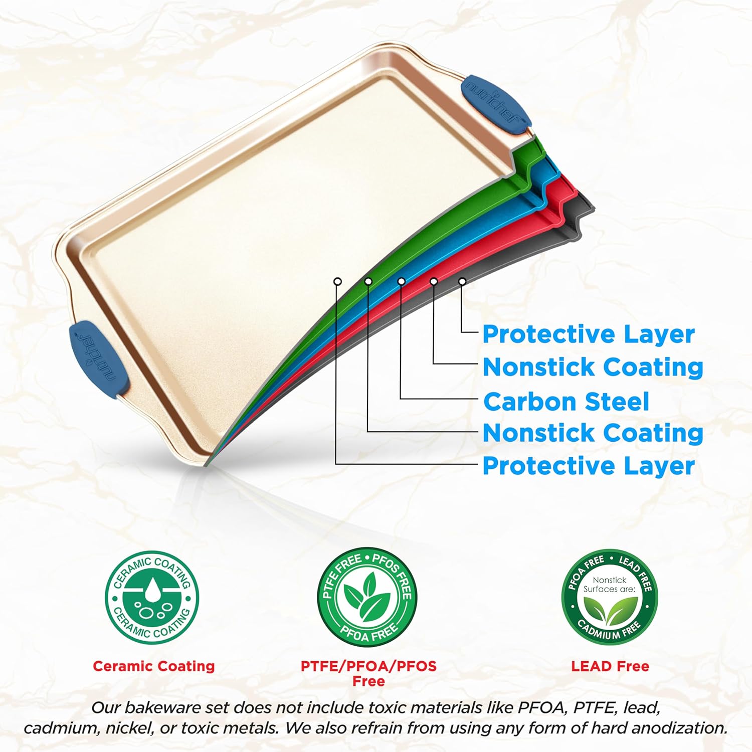 - HEATPROOF SILICONE HANDLES:The commercial grade restaurant quality kitchen bakeware features blue silicone handles to prevent accidental burns. Also stain-resistant, easy to clean & dishwasher safe but hand washing is recommended to extend pan life