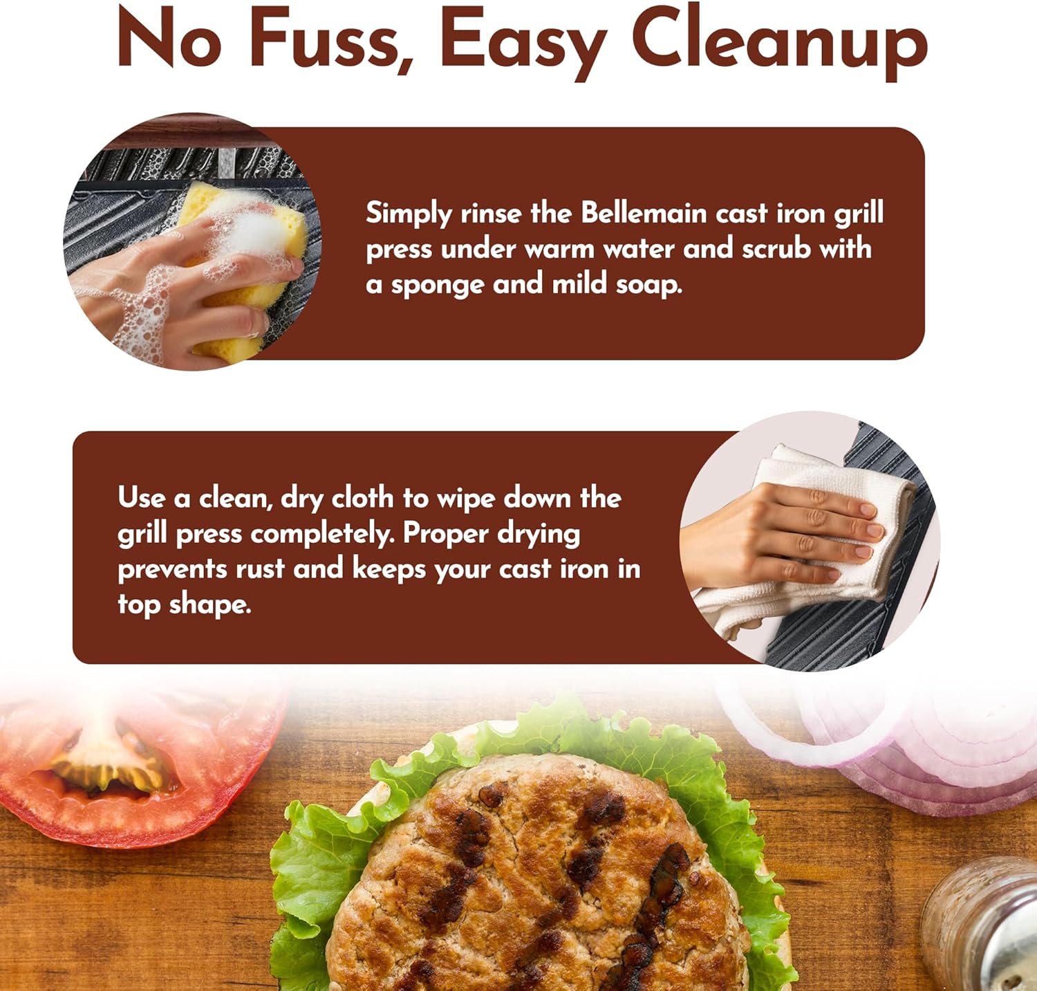 - PRE-SEASONED , CAST IRON | DESIGNED FOR EASY USE AND CLEAN-UP: From grilling to pressing , you demand perfection . But when the food is done and eaten , that’s when Bellemain shines . Just wipe with a damp cloth and dry to keep the artisanal , bold style of your grill press as strong as ever .