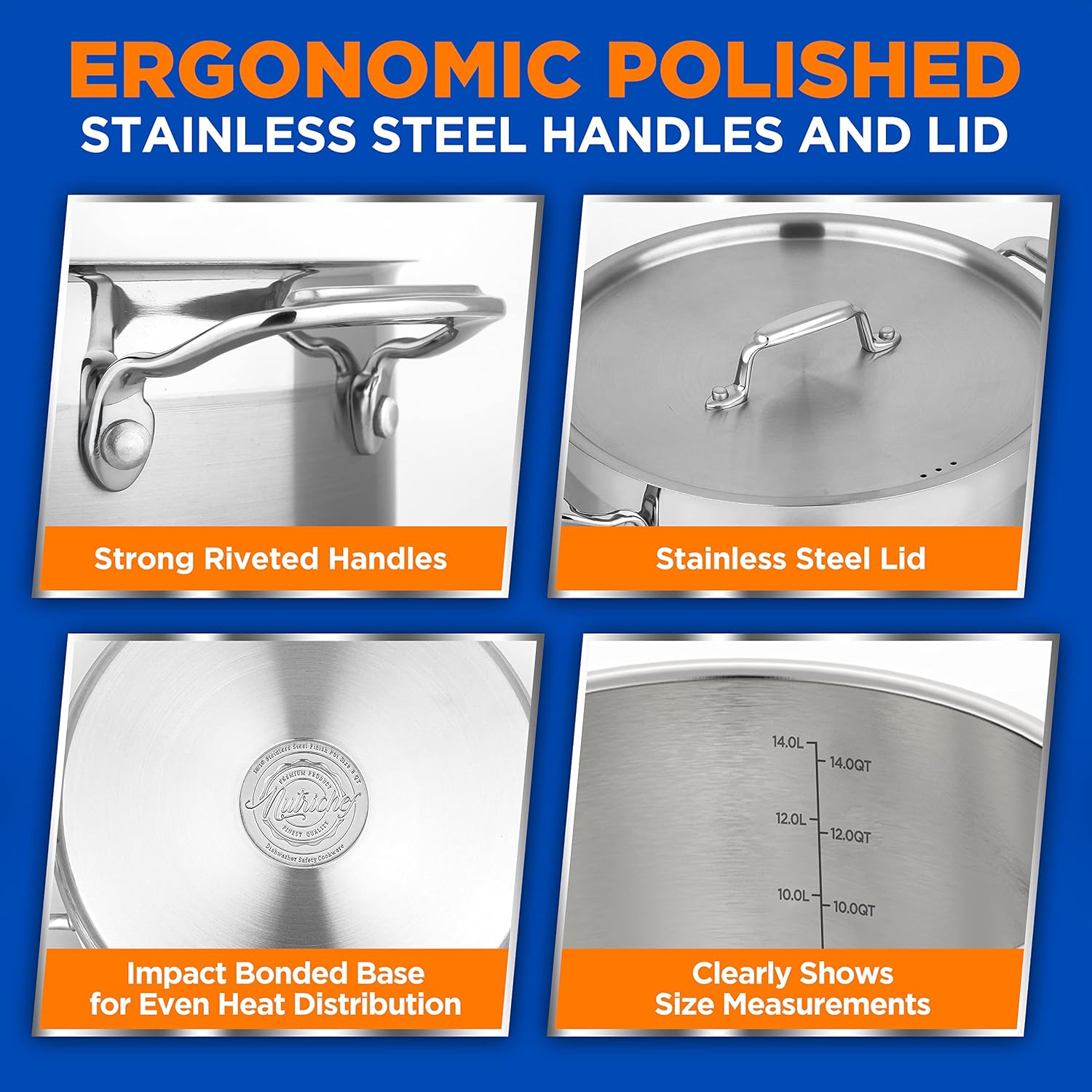 - GENEROUS CAPACITY: The NutriChef 14 Quart Stockpot is perfect for cooking medium to large batches of soups, stews, and sauces. Its ample size makes it ideal for family meals and entertaining
