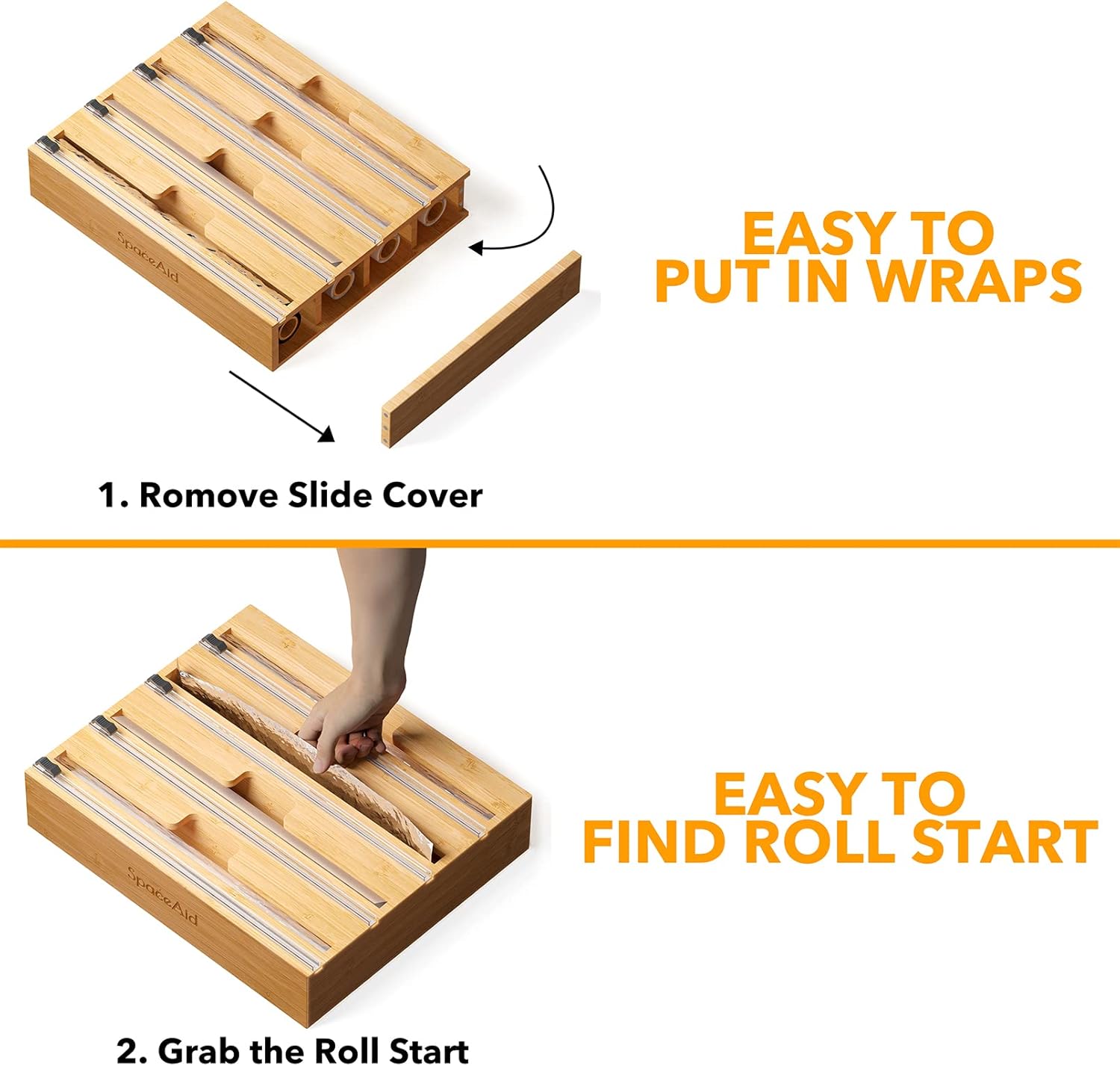 SpaceAid WrapNeat 4 in 1 Wrap Dispenser with Cutter and Labels, Plastic Wrap, Aluminum Foil and Wax Paper Dispenser for Kitchen Drawer, Bamboo Roll Organizer Holder, Compatible with 12" Roll