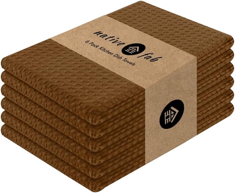 Native Fab Cotton Kitchen Towel with Hanging Loop 16x26 inches, 6-Pack, Waffle Weave Kitchen Towels for Cleaning Drying, Washcloths Soft & Absorbent Cloth Rags, Bar Towel, Dish Cloth, Brown
