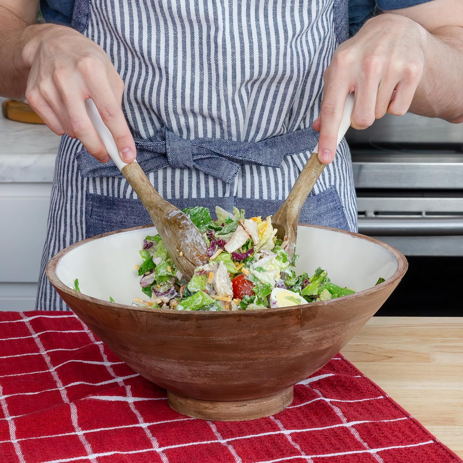 - Color: Bowl- Brown natural wood exterior, white enamel interior; Spoons- White handles with wooden utensil ends