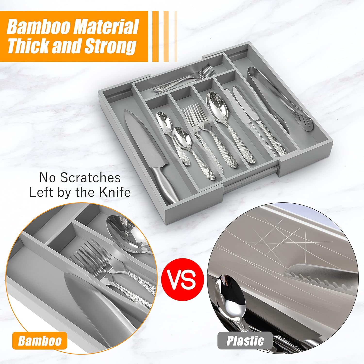 - ✅【Fit your drawer perfectly】Still measuring every kitchen drawer and buying a kitchen drawer organizer of the same size? Our bamboo silverware drawer organizer is designed with 5-7 compartments. Thanks to its adjustable features, our expandable drawer organizer can be expanded from 10 to 15 inch wide, Perfect for any kitchen drawers.