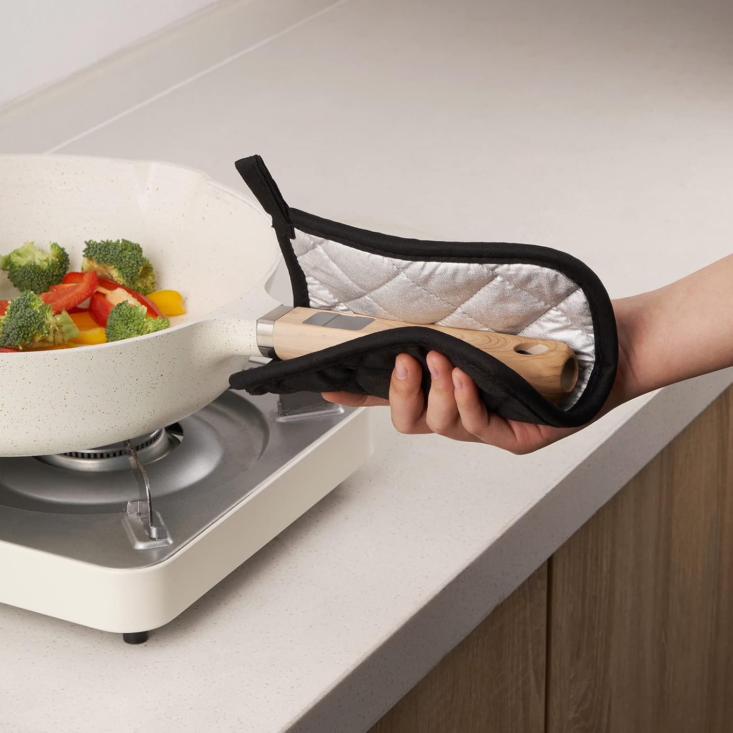 - QUALITY PRODUCT: 100% terry looped cotton on one side and a heat resistant silverstone lining on the other with pure cotton filled. Hanging loop allows for easy storage, easy to clean, durable.
