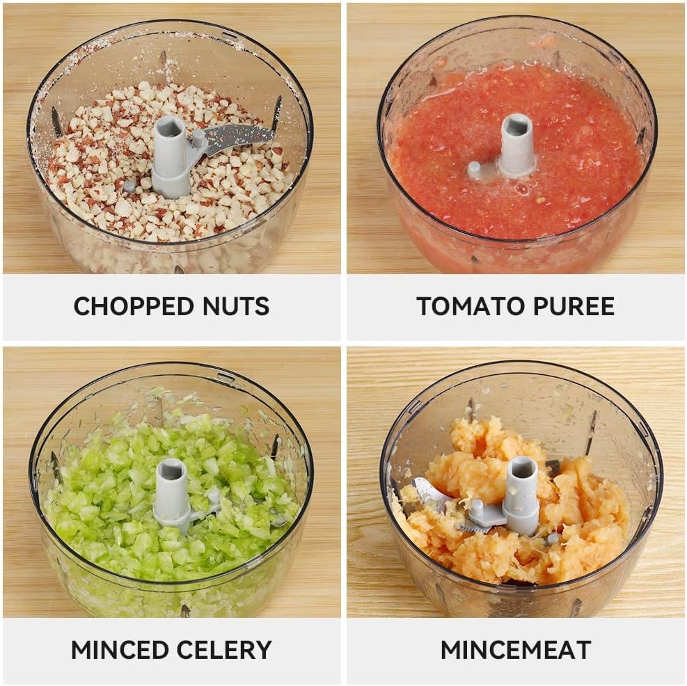 - 🥦Super Quick Chopping Vegetables: Why can our manual processor process food so quickly? All thanks to our sharp blades. The curved blade edge increases the contact area between the food and the blade, and the three blades are distributed in different directions and heights, so that all the ingredients can be fully chopped. When you pull the string, the blade acts like a fan, making rapid contact with the ingredients, so as to achieve the purpose of fast grinding.
