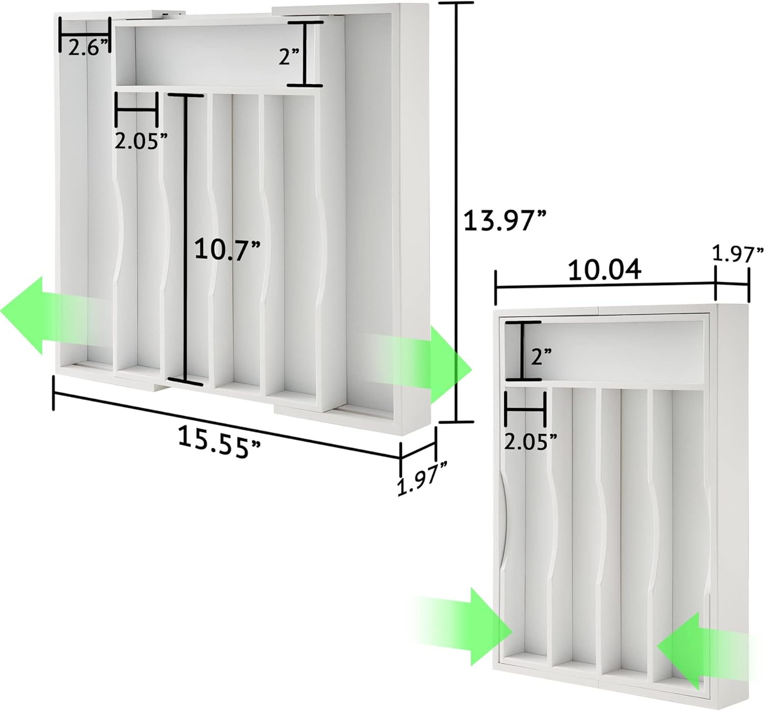 - [START YOUR KITCHEN ORGANIZATION]: The 10.04" - 15.5" wide, 13.98" long and 1.97" deep bamboo drawer organizer can tame your out-of-control kitchen drawers, to store and organize the cutlery and kitchen utensils according to your rules, and maximize the drawer storage. Keep everything accessible and organized, so that you don't have to rifle around for your cooking tools. Beautiful and practical kitchen drawer organizer turns the cooking and tasting into things of beauty and efficiency.