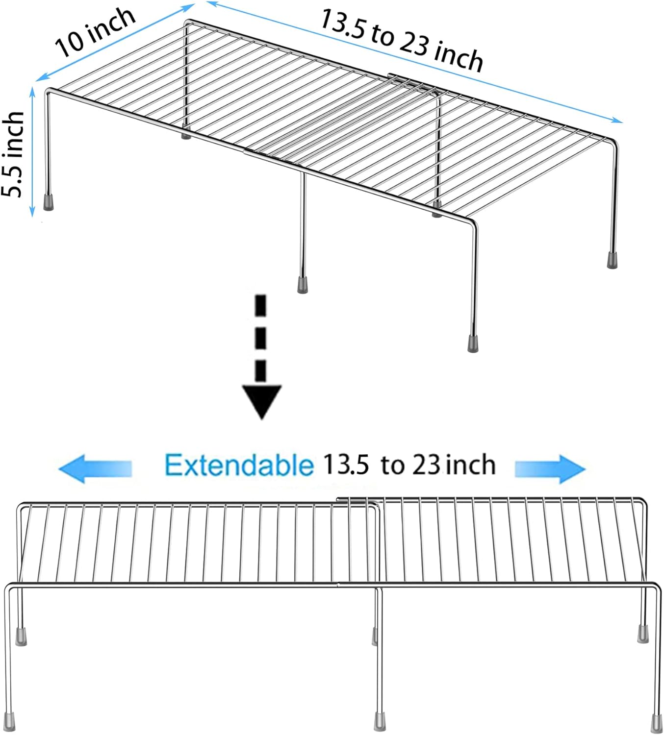 - EXPANDABLE DESIGN: The length of this shelf can be adjusted to your desire. It can vary from 13.5 inches to 23 inches in length depending on how you want to arrange your space. This product is tailor-made for customers who faces difficult product selections. Size:13.5 to 23 L x 9.4W x 5.5 H inch.