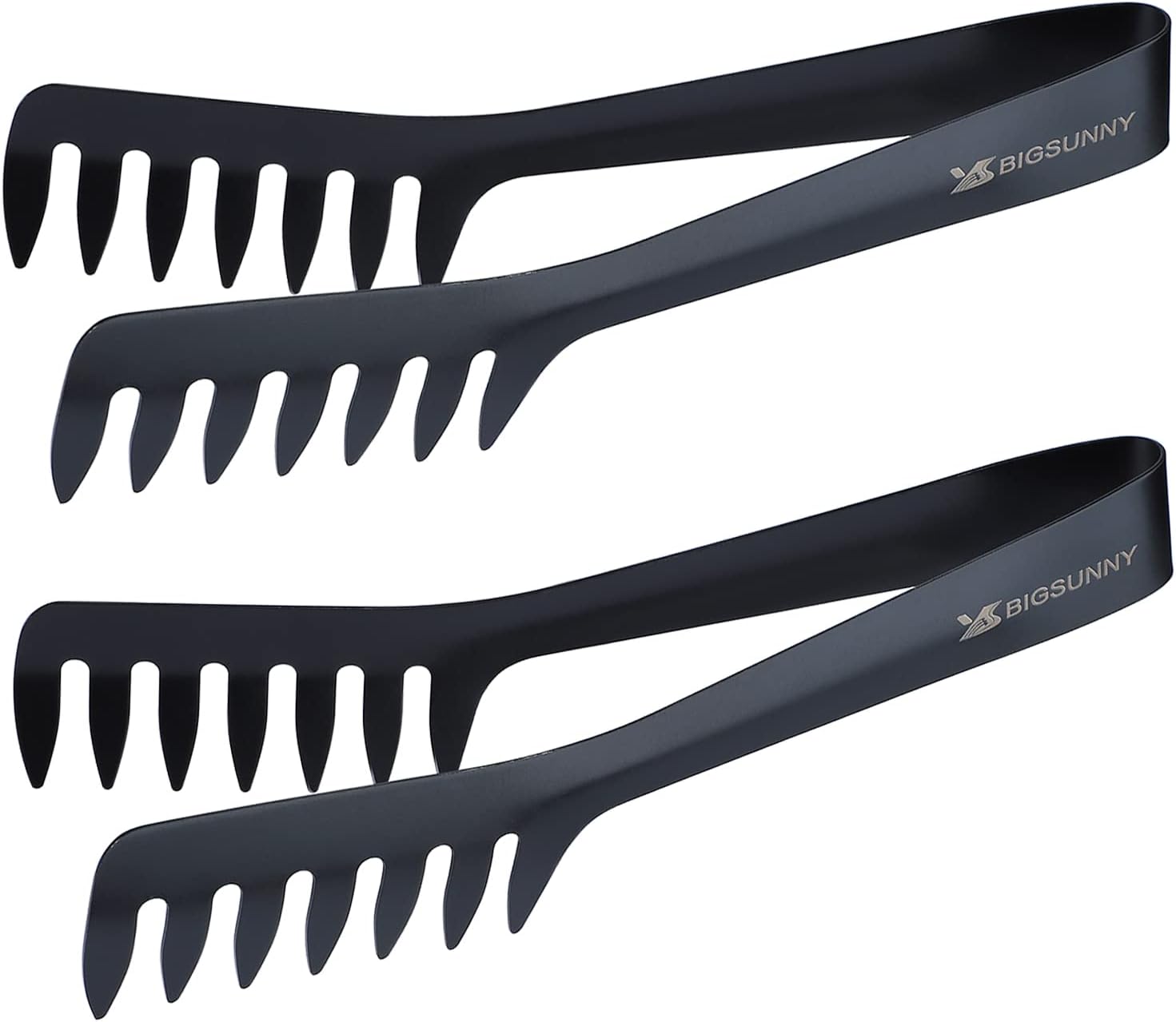 MSY BIGSUNNY 8-Inch Pasta Tongs, Stainless Steel Food Serving Tongs, Rust-Proof Spaghetti Tongs (Set of 2, Black)