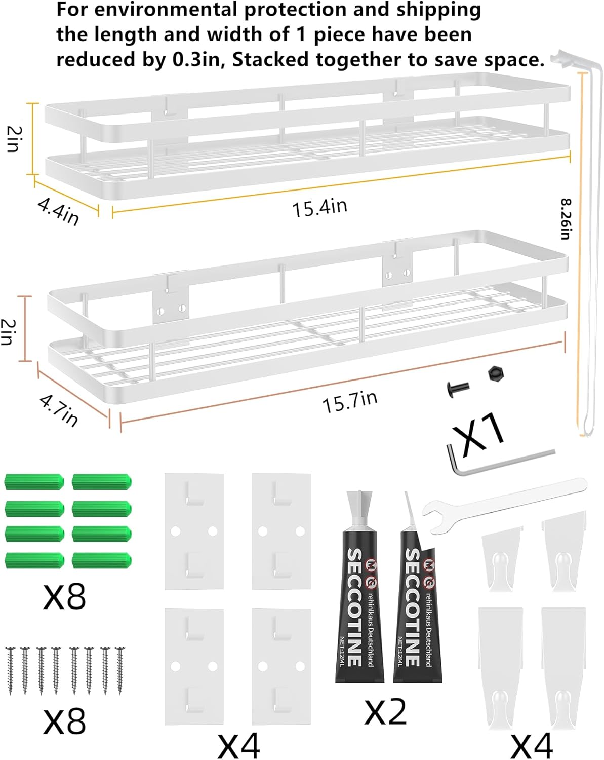 - 【What You Get】- 2 x Shower Caddies, 2 x Adhesives, 1 x Manual, 4 x Load-bearing patch, 8 x nails and accessories, 4 durable hooks. 100% satisfaction customer service!