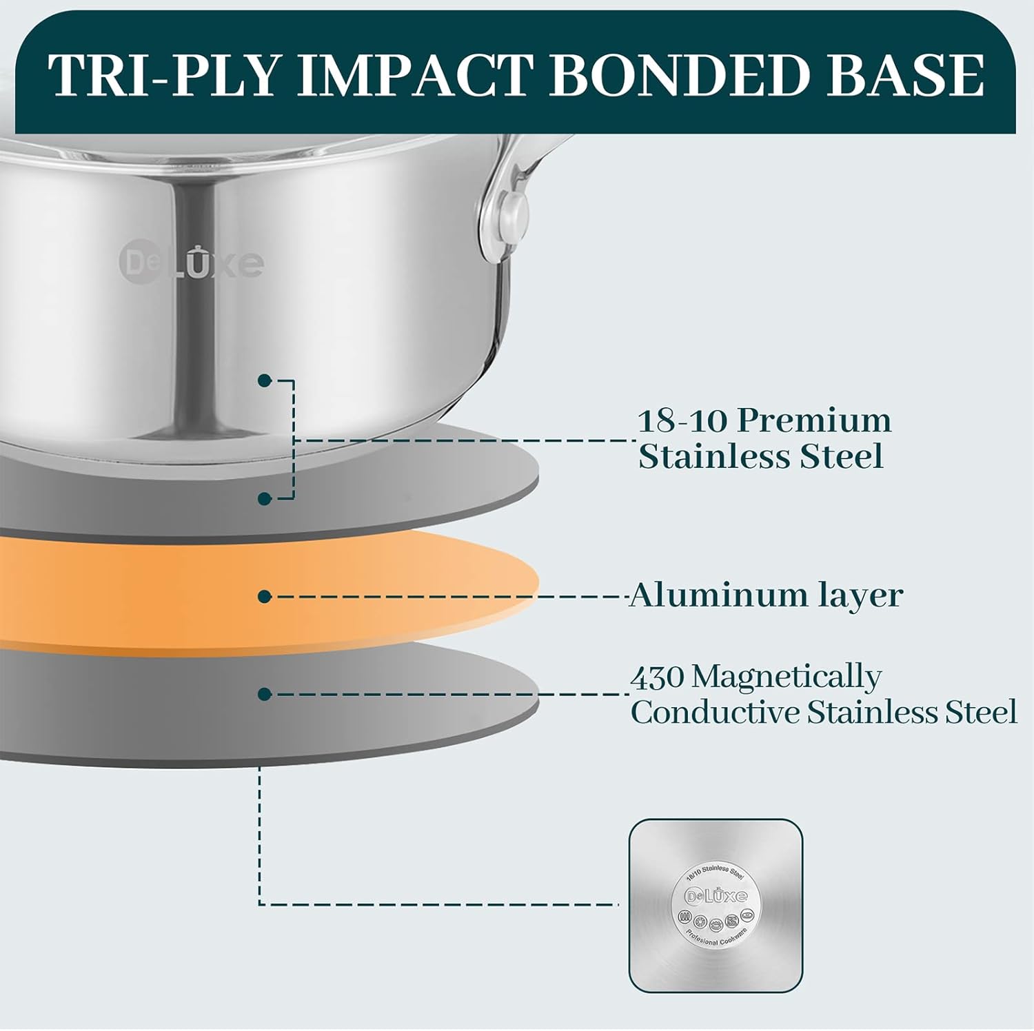 - [Food Grade Premium Stainless Steel] Made of 18-10 premium stainless steel with a tri-ply (2 stainless steel + 1 aluminum core) impact-bonded base, this pan ensures even and quick heating. It is also corrosion & oxidation resistant, and is safe for contact with food
