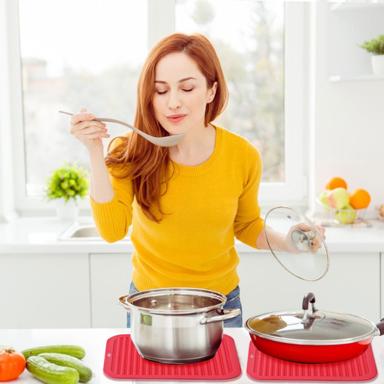 - 🍓【VERSATILE SILICONE TRIVETS】The 2 pack silicone trivet mats are good kitchen accessories for anything that needs heat protection or grip; use them as a silicone hot pad for hot pot, red hot pot holder, red silicone mat for air fryer, silicone placemat, pot mat, coffee maker mat for countertops, dish drying mat, jar opener, red spoon rest, and so on.